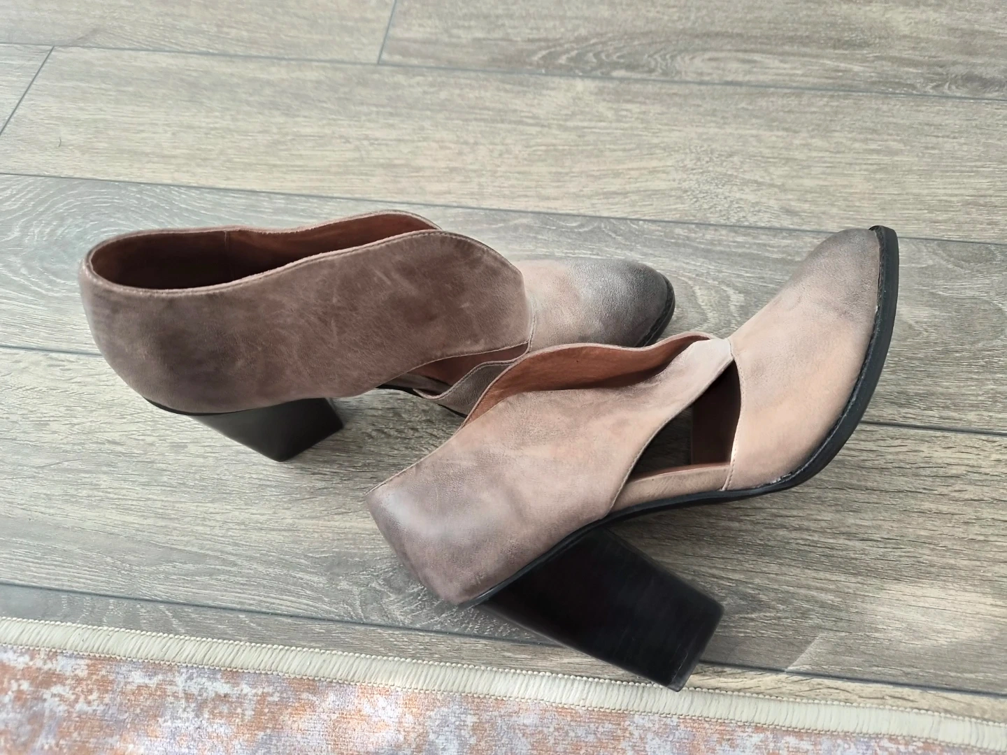 Stylish taupe suede booties from Jeffrey Campbell and Free People. These feature a pointed toe and a comfortable block heel. Size is 9.5.
