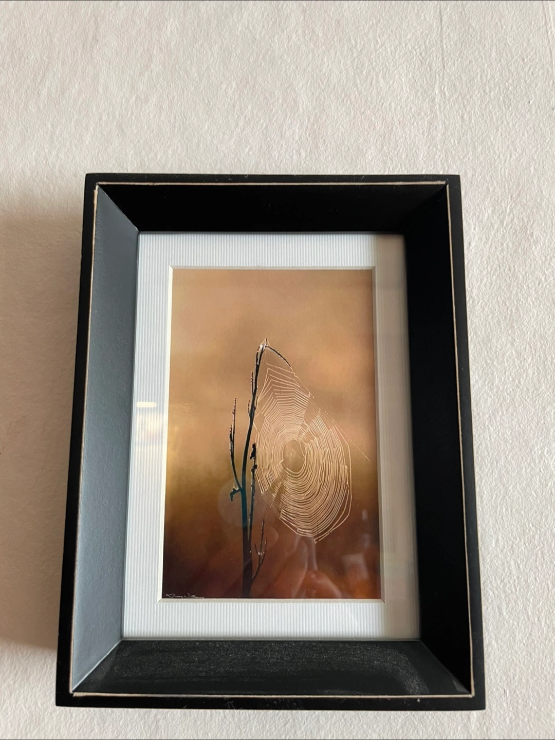 Beautiful framed photo of spiderweb on a branch. Eliana Wittweier photographer.