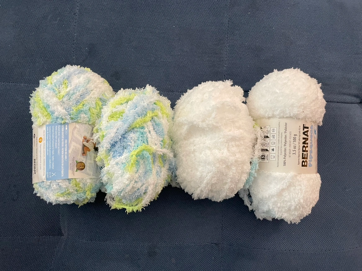 Two balls of Bernat Pipsqueak yarn in a multi-colored pattern and two balls of Bernat Pipsqueak yarn in white. Perfect for baby blankets! Two balls have been partially used.