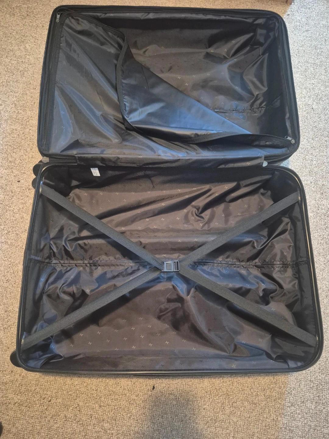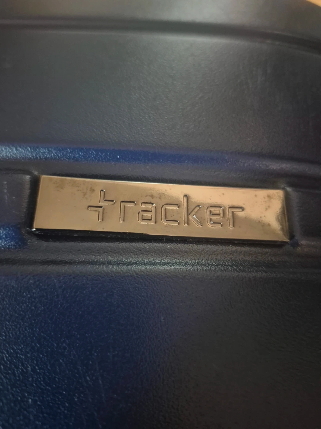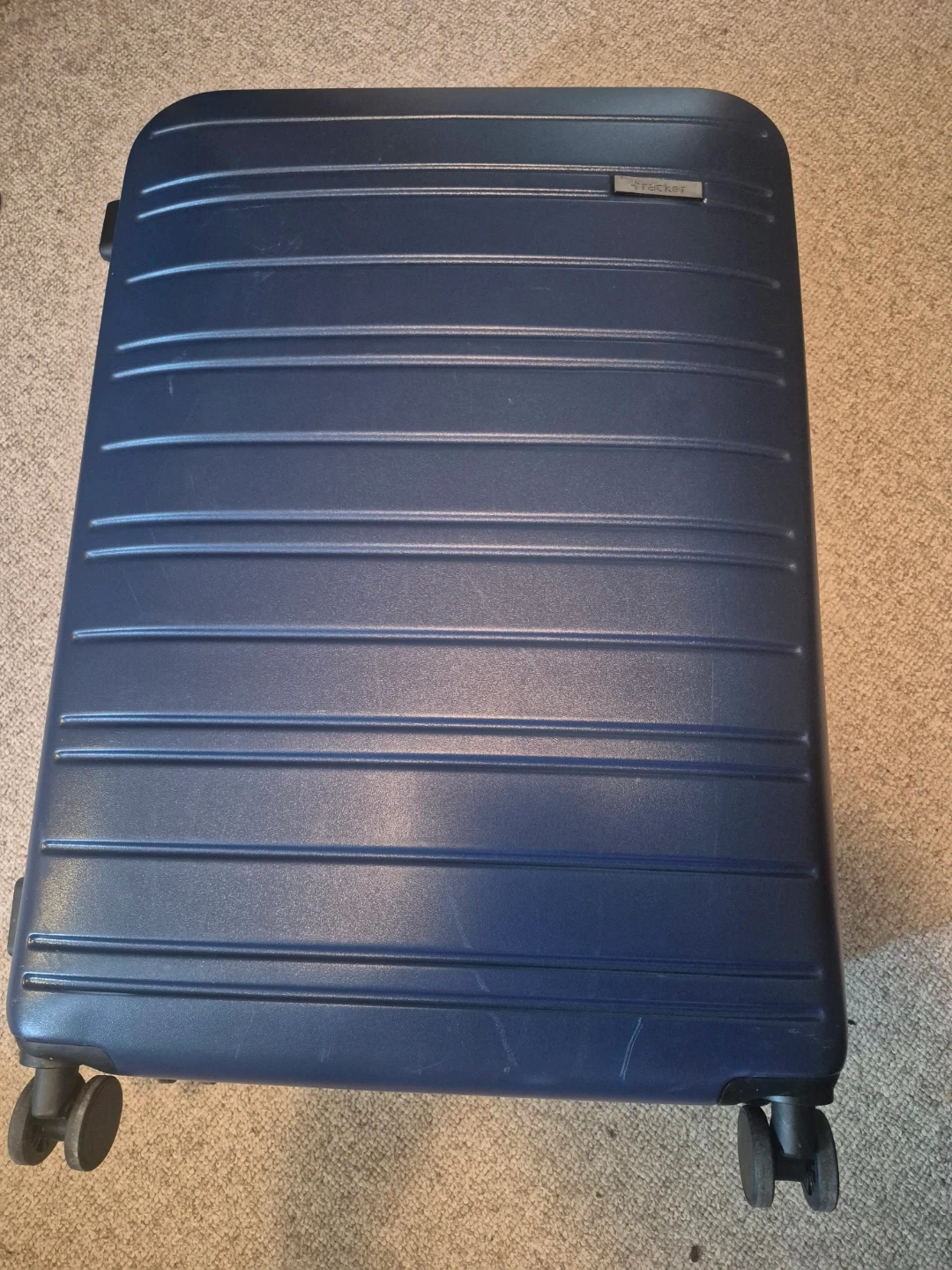 This is a navy blue hardside suitcase by Tracker. It's made of durable material and features four spinner wheels for easy manoeuvring. The interior has tie-down straps to secure your belongings. Only used a couple times. Pretty much brand new.