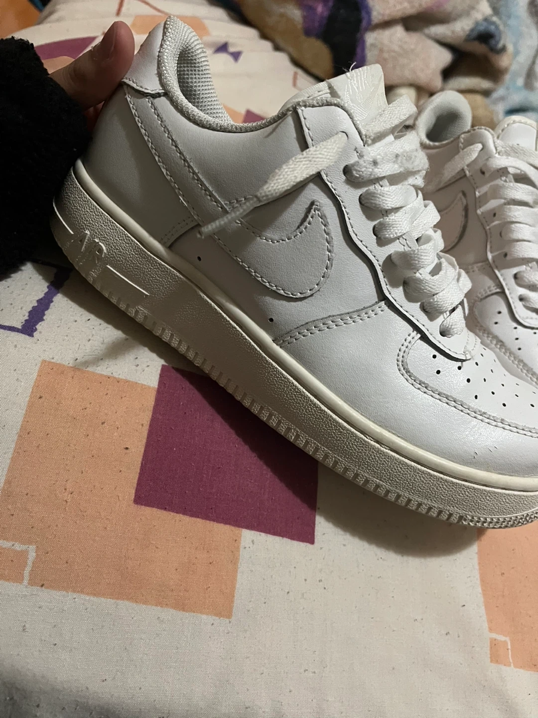 Classic white Nike Air Force 1 sneakers. These iconic shoes are made with leather. They feature a lace-up closure for a secure fit. Great for everyday wear!