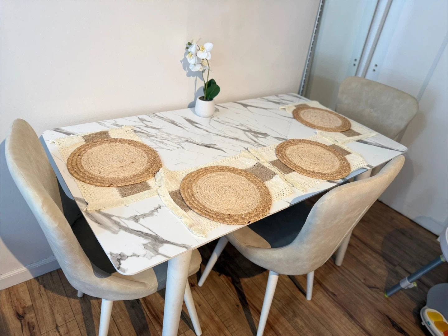 Stylish dining set with a white marble-look tabletop and light beige upholstered chairs. Tabletop is easy to clean. Chairs offer comfortable seating for family meals. Set includes table and three chairs.