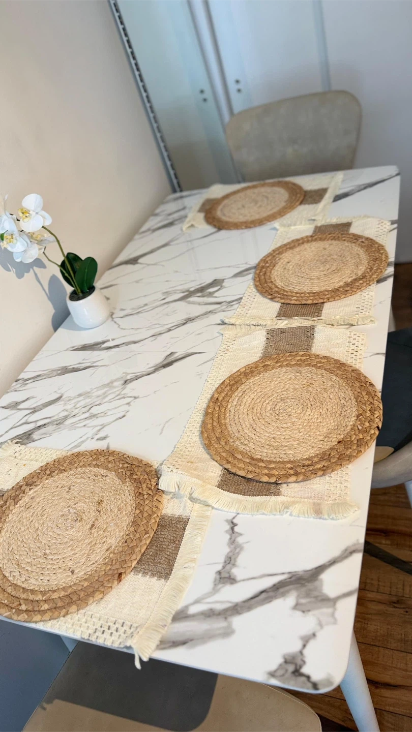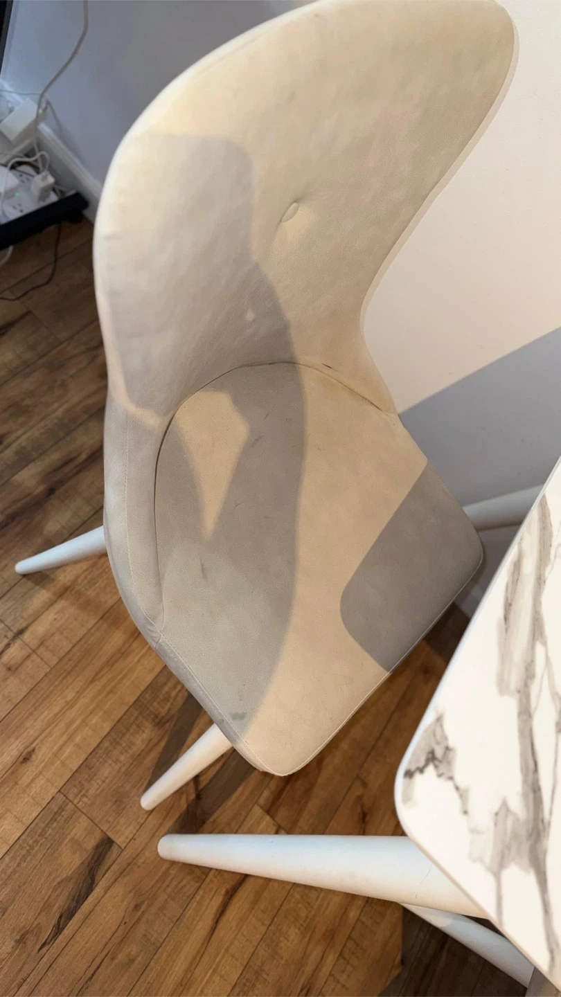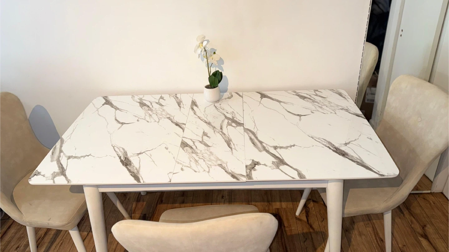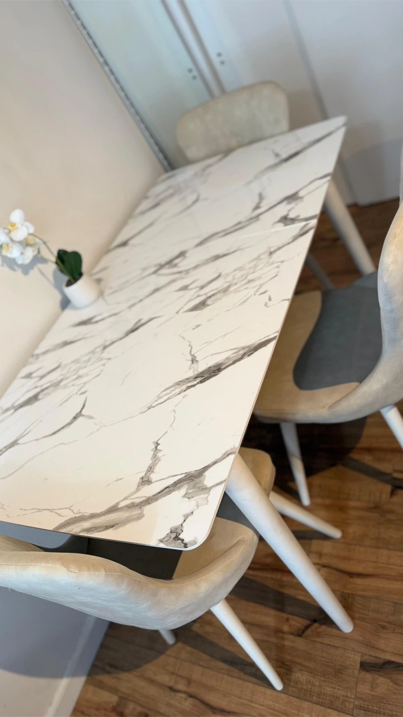 Stylish dining set with a white marble-look tabletop and light beige upholstered chairs. Tabletop is easy to clean. Chairs offer comfortable seating for family meals. Set includes table and three chairs.
