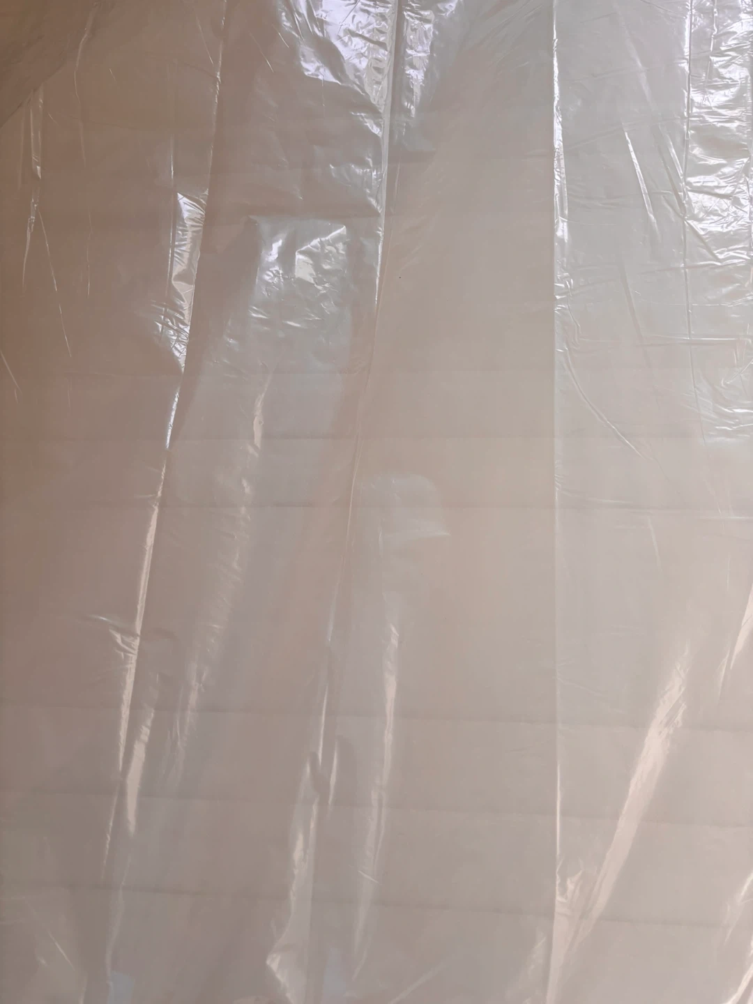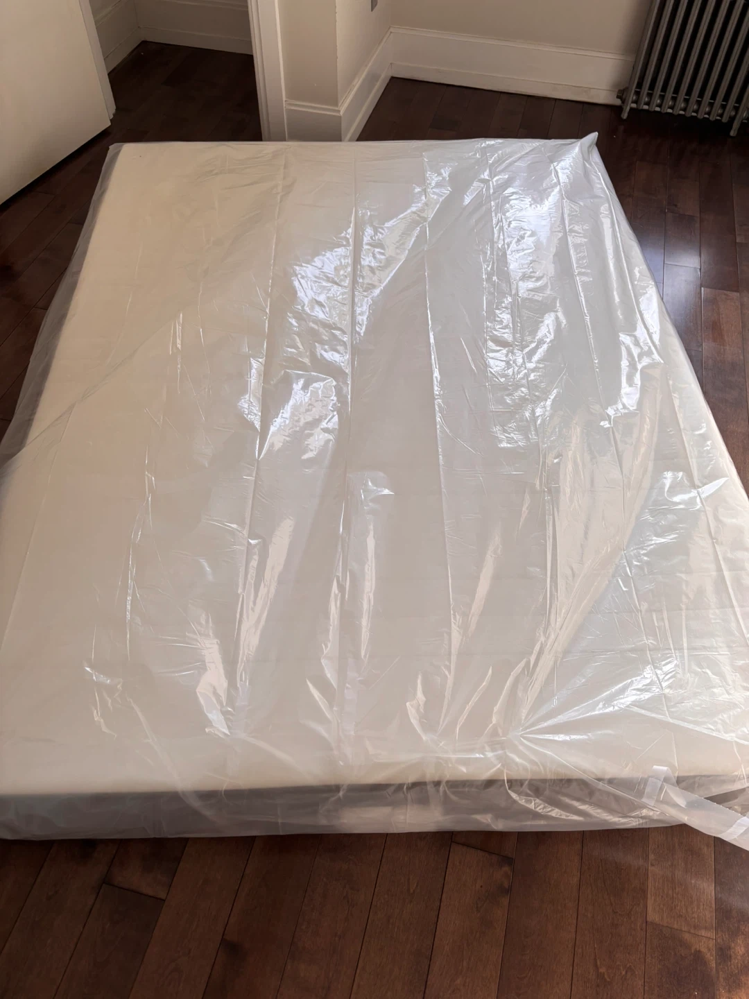 This is a queen size mattress, still in its original plastic packaging. It's a neutral gray color. This mattress is ready for a new home!