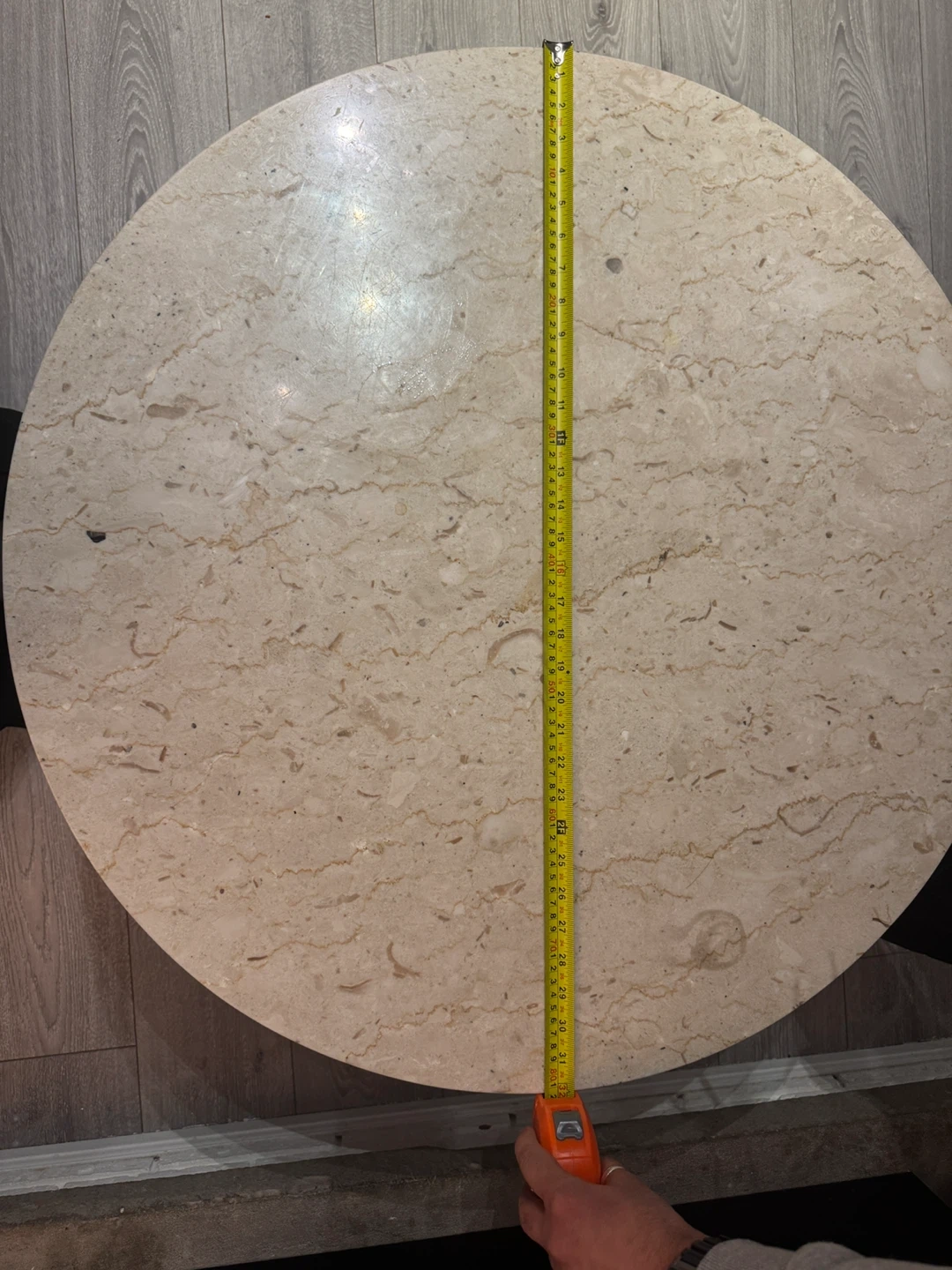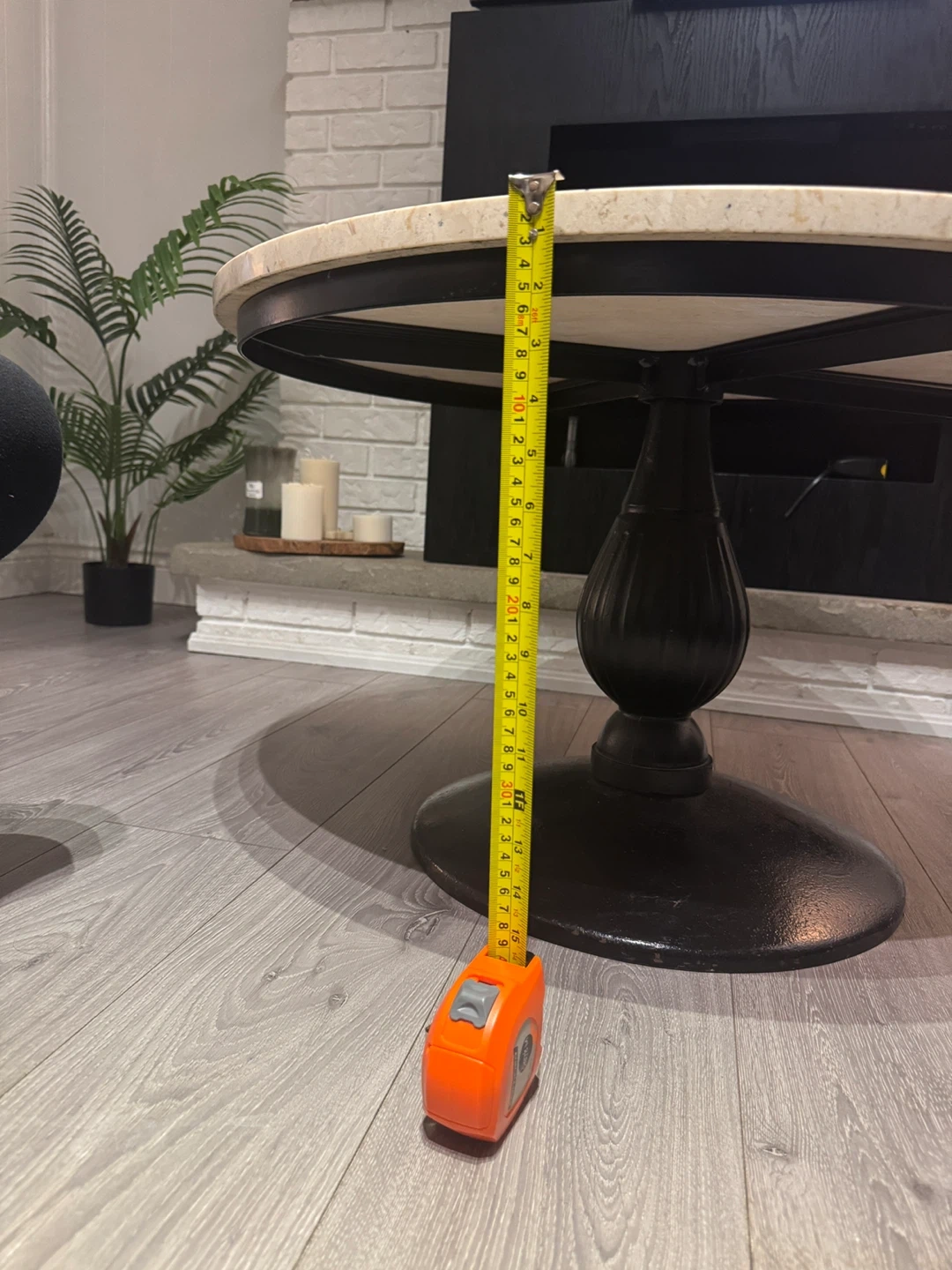 A stylish round coffee table with a beige marble top and a dark pedestal base. It's approximately 18 inches in height and 24 inches in diameter. This table's classic design makes it a great centrepiece for your living room.