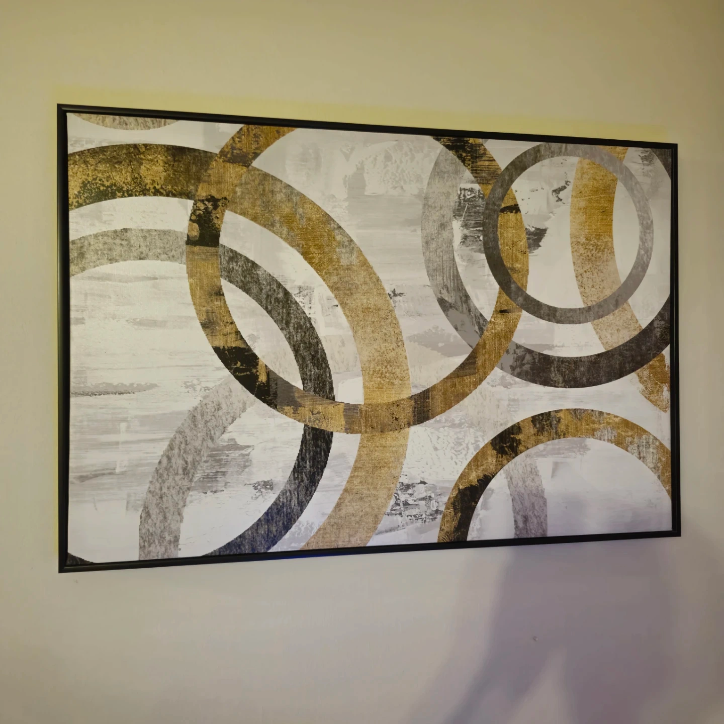This framed wall art features an abstract design with overlapping circles in gold, grey, and black tones. It's a striking piece for any room! The art is printed on canvas and comes in a black frame.