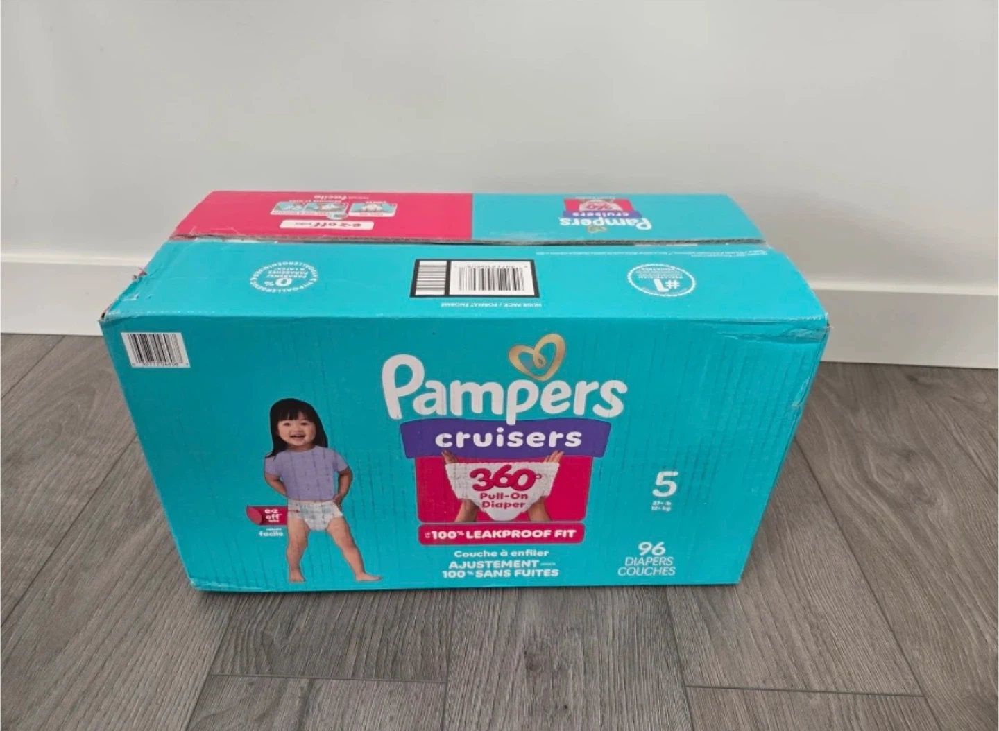 This box contains 96 Pampers Cruisers Size 5 pull-on diapers. They offer a 360° leakproof fit for reliable protection. These diapers are designed for comfort and ease of use.