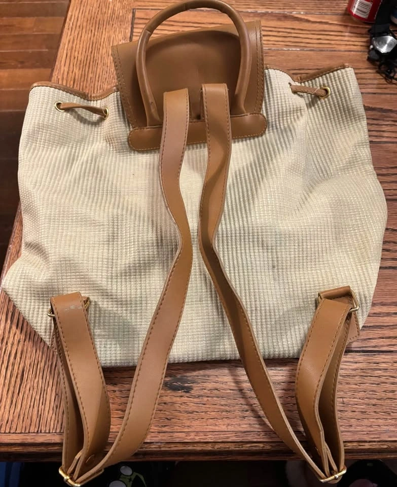 Good condition. Great vegan leather bag, with a handle or backpack straps. Has a drawstring closure to the large interior, with one zippered pocket inside. No holes, a few marks inside from use but nothing intense. Would make a great beach bag or day trip bag. 11”x12”, 6” wide. Cash or e-transfer accepted.