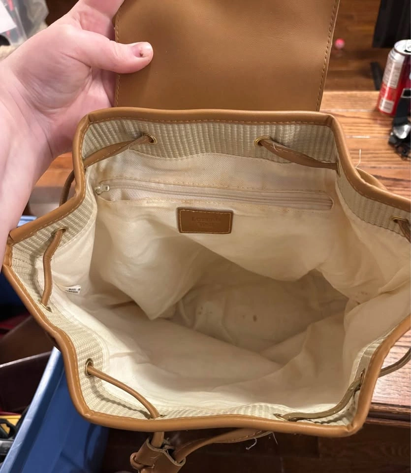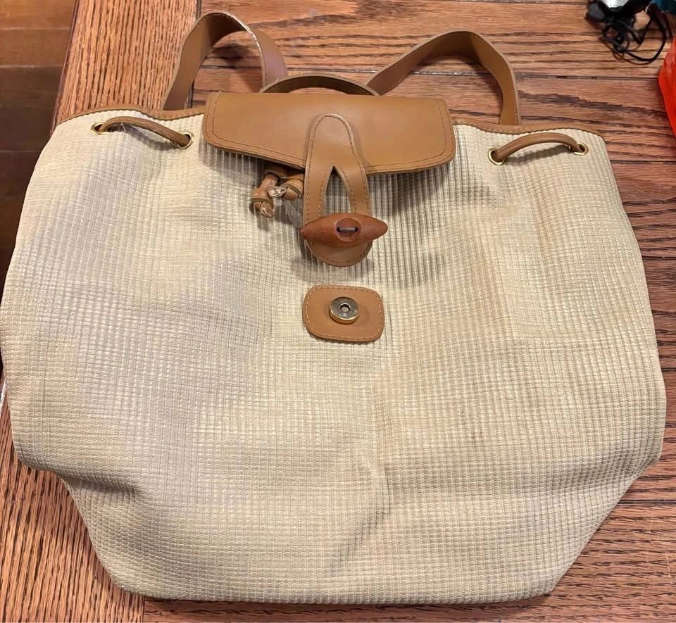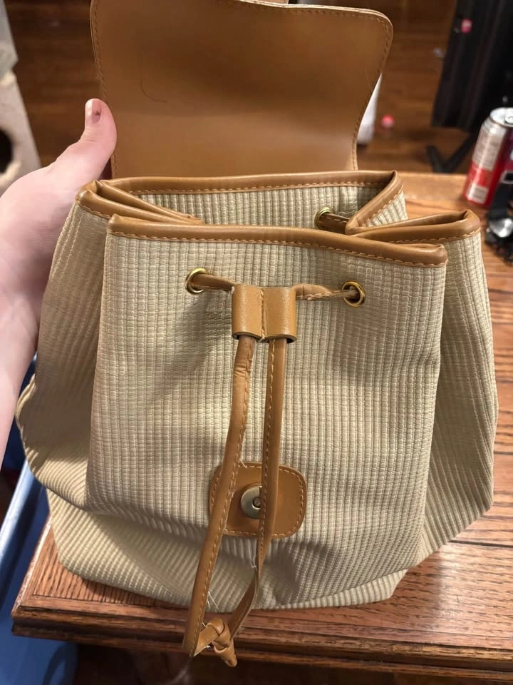 Good condition. Great vegan leather bag, with a handle or backpack straps. Has a drawstring closure to the large interior, with one zippered pocket inside. No holes, a few marks inside from use but nothing intense. Would make a great beach bag or day trip bag. 11”x12”, 6” wide. Cash or e-transfer accepted.