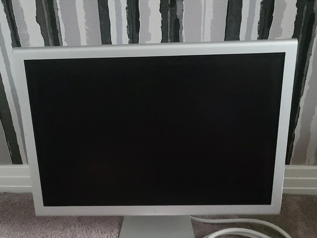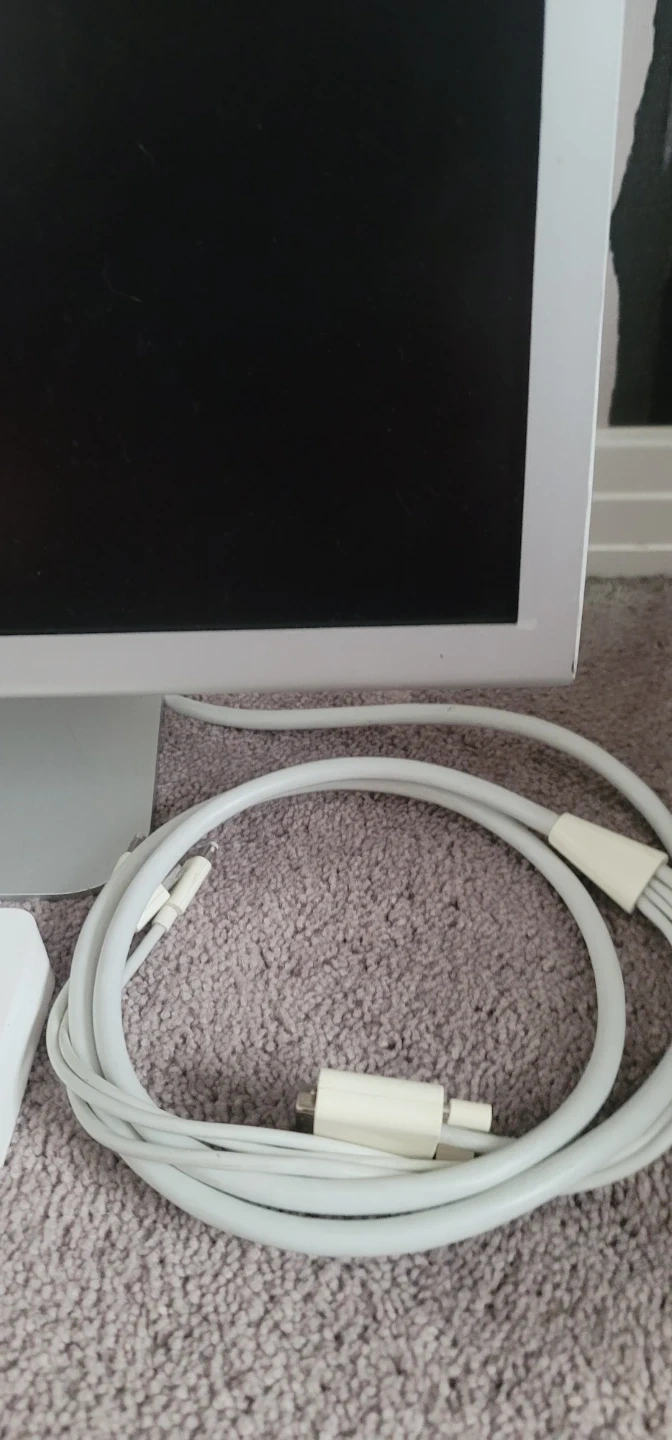 This is a 20-inch Apple Cinema HD Display monitor. It's a flat-panel LCD display with a resolution of 1680x1050. It comes with its original power adapter and cables. This monitor is great for creative work or general computer use.