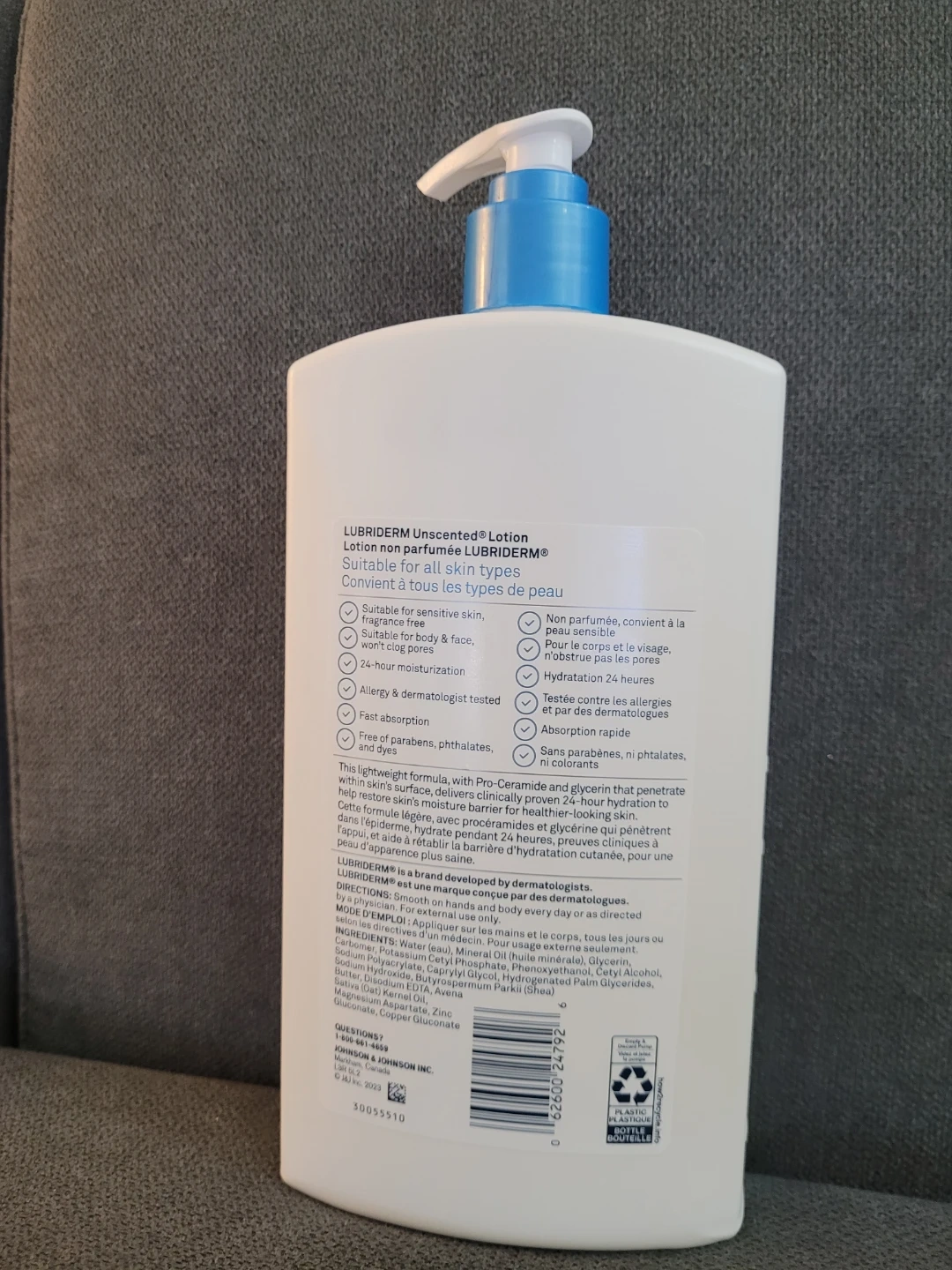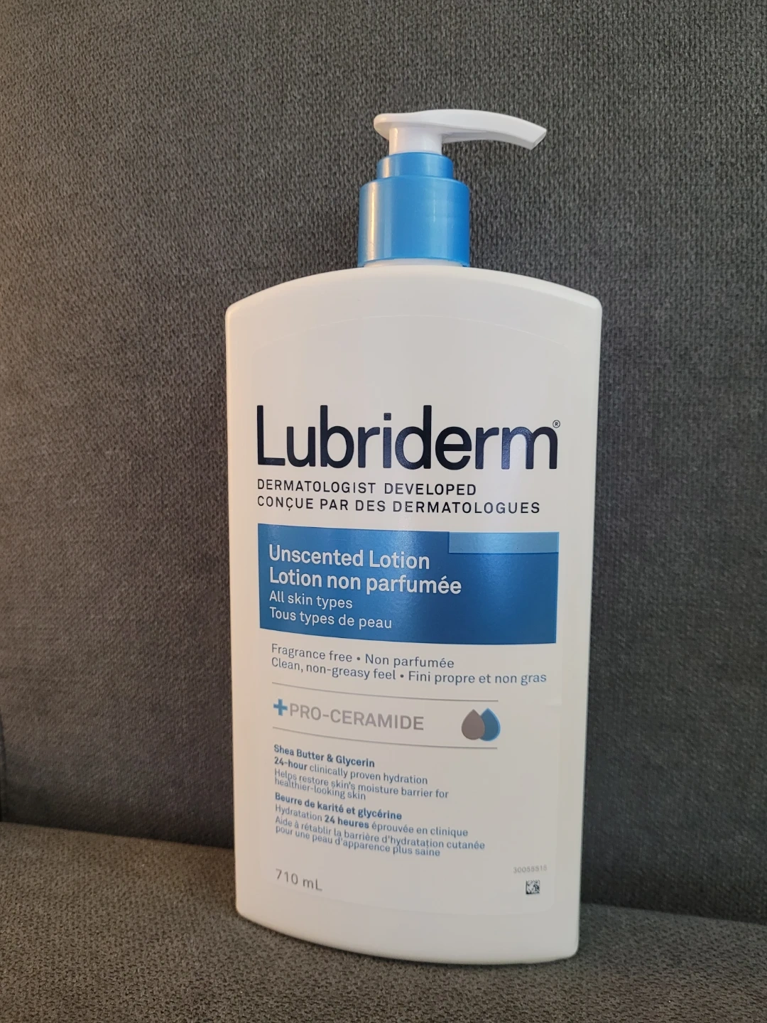 This is a 710 mL bottle of Lubriderm Unscented Lotion. It's formulated with Pro-Ceramide and glycerin for 24-hour hydration. Suitable for all skin types, this lotion is fragrance-free, clean, and non-greasy. It's great for everyday use on hands and body.