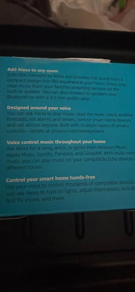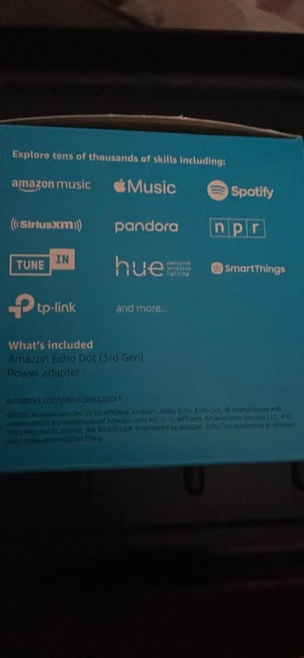 This is a Black Amazon Echo Dot (3rd Gen) that connects to Alexa to play music, answer questions, and control smart home devices. It features Bluetooth, Wi-Fi, and an audio line out. Includes power adapter. Brand new, still in sealed box. Pick up close to Wellington and Seminary (Wellington Brown/Purple Line).