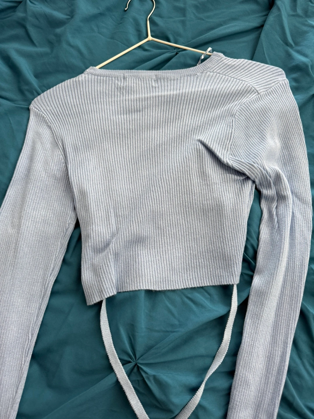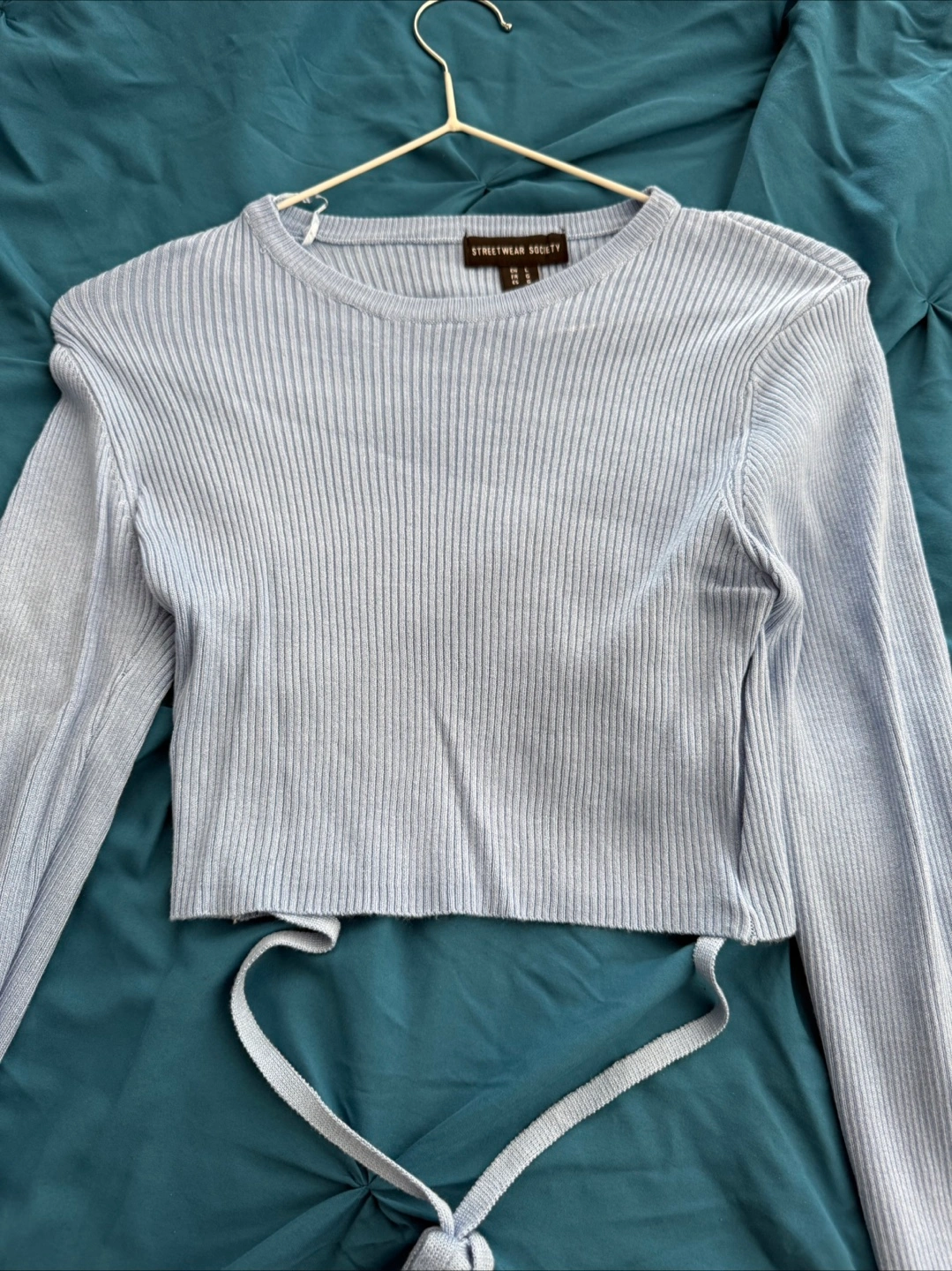 Long-sleeved top. Light blue colour. Ribbed design. Featuring a cropped cut. Includes ties at the waist, which can be adjusted for a comfortable fit.