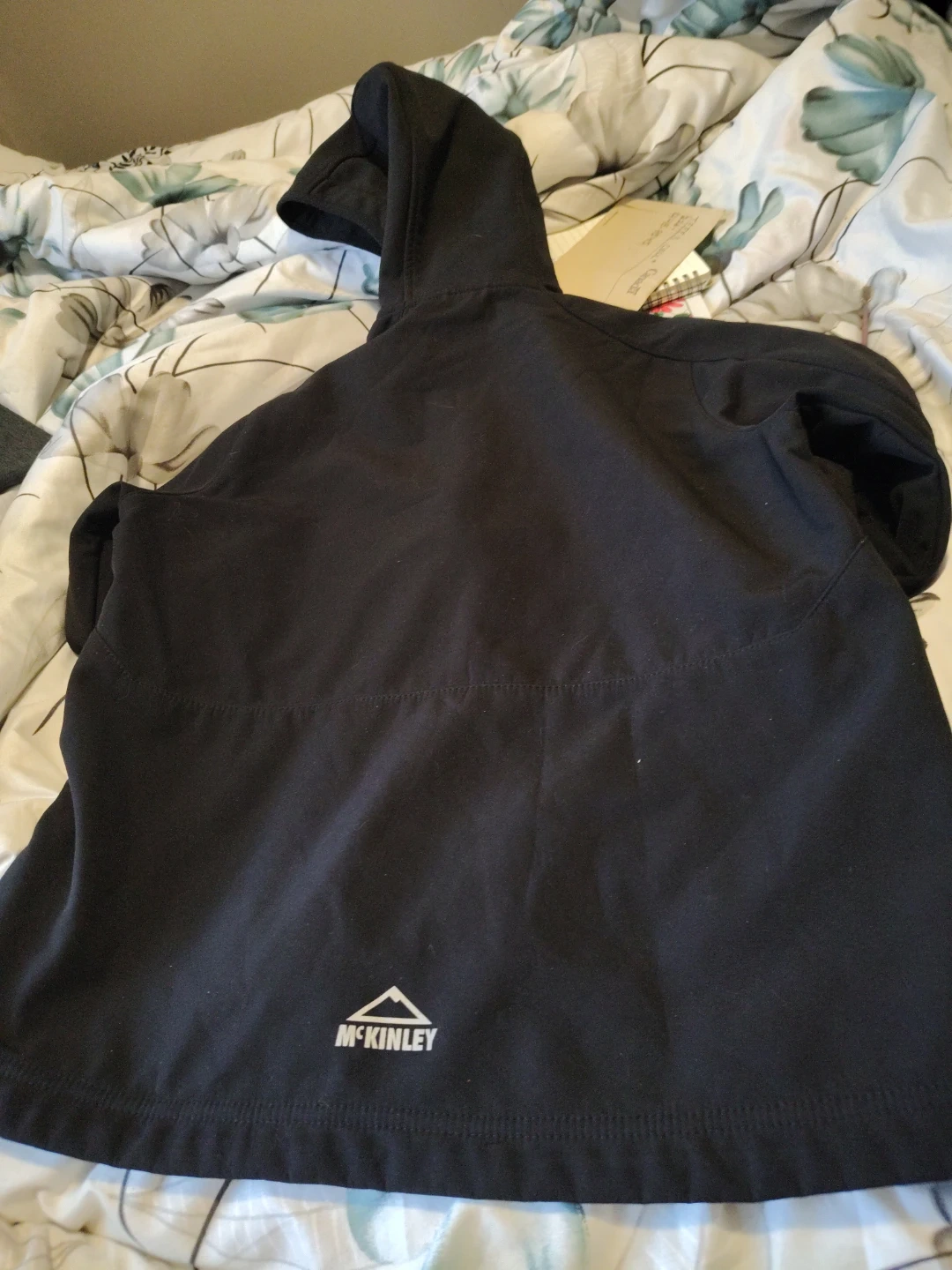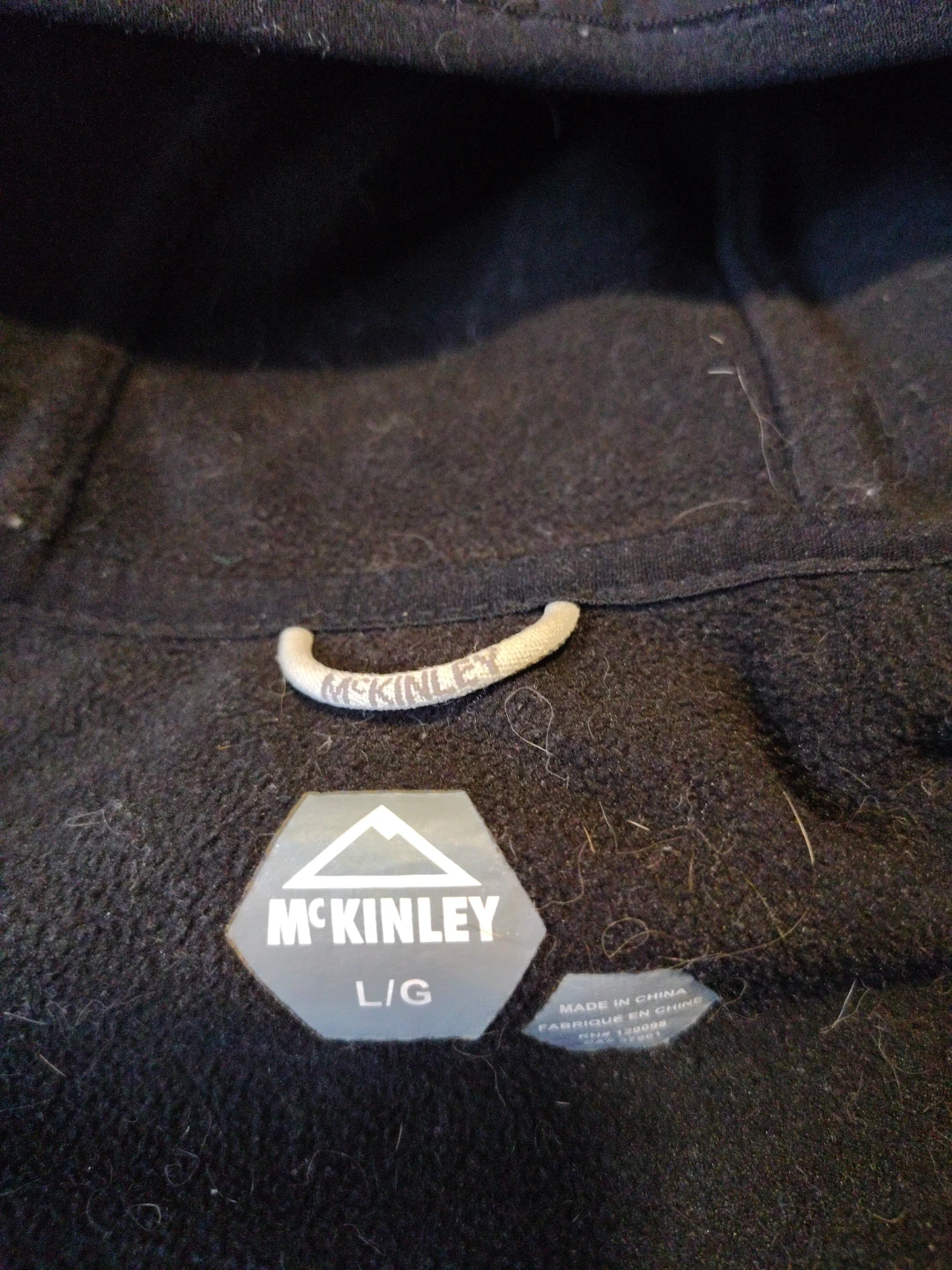 This is a McKinley black hooded jacket with a full zip. It's a size large (L/G) and features the Ventmax technology. This jacket is great for outdoor activities or casual wear.
