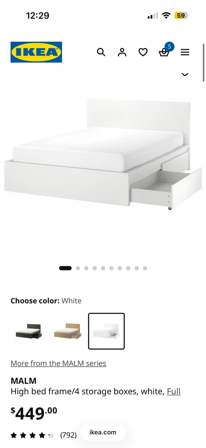 IKEA MALM high bed frame in white. It includes four storage boxes for convenient organization. This bed frame is a full size.
