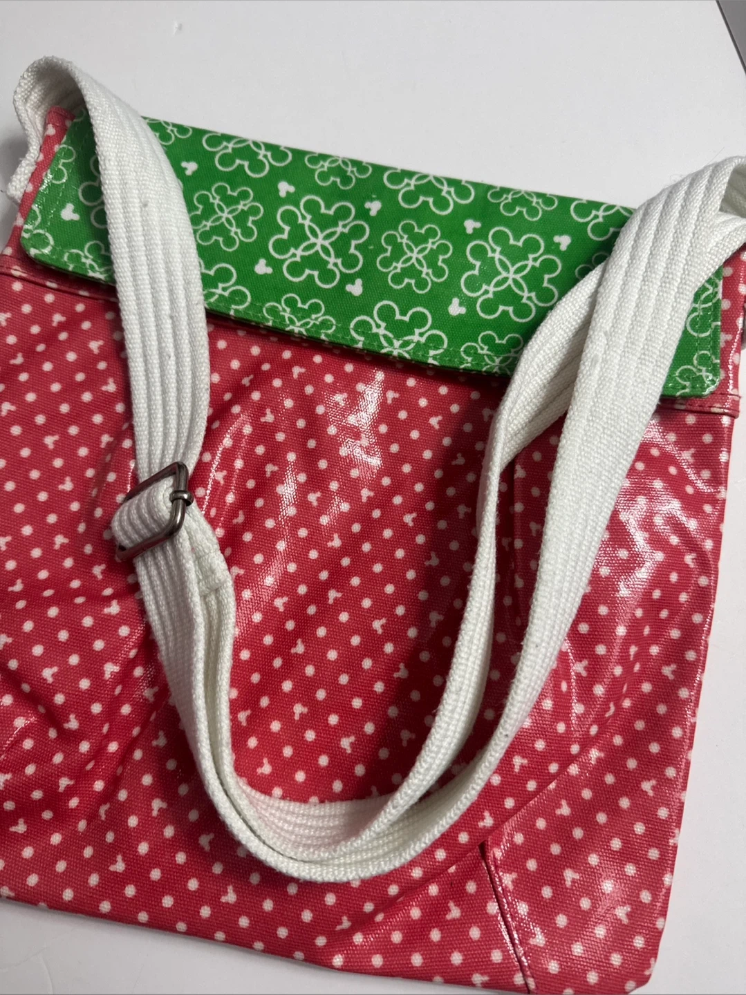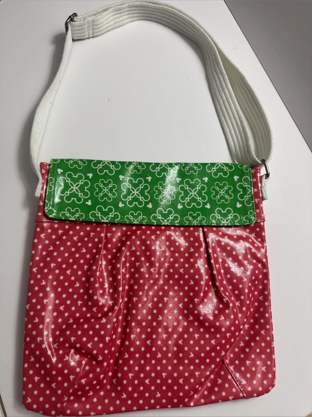 This fun crossbody bag features a vibrant red polka dot pattern on the main body and a green flap with a white Mickey Mouse print. It has a durable white strap with an adjustable metal buckle. This bag's cute design makes it a great accessory for fans!