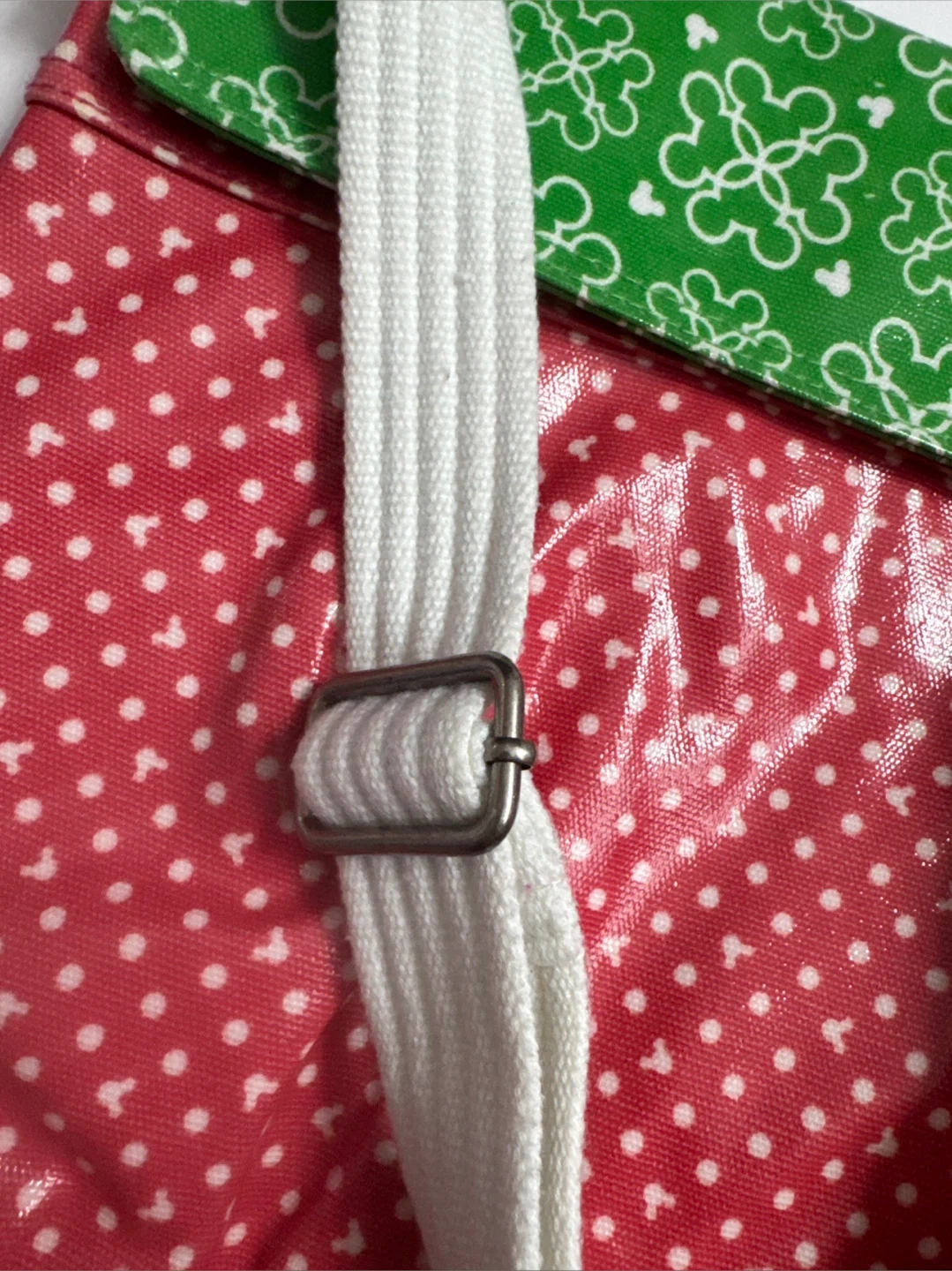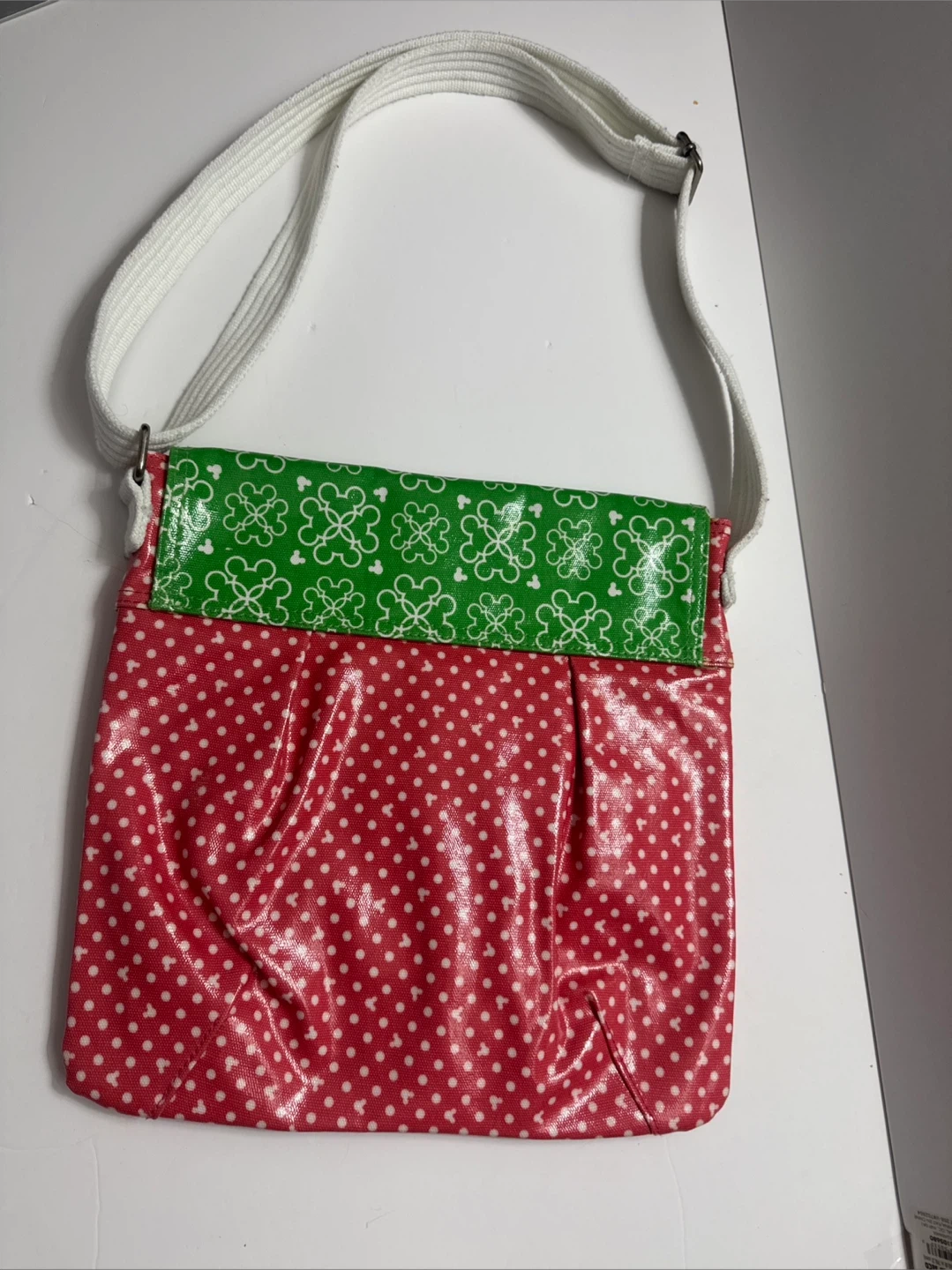 This fun crossbody bag features a vibrant red polka dot pattern on the main body and a green flap with a white Mickey Mouse print. It has a durable white strap with an adjustable metal buckle. This bag's cute design makes it a great accessory for fans!