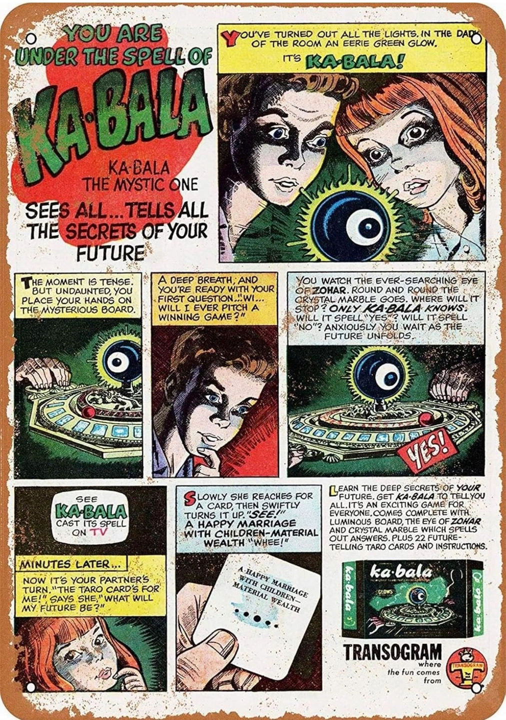 This is a replica of the 1967 Kabala board game, making it a great gift for vintage game collectors. It's a 12" x 16" metal sign with rounded corners and pre-drilled mounting holes for easy wall hanging. Please note: the pictures might make the lettering appear raised, but it is actually flat.