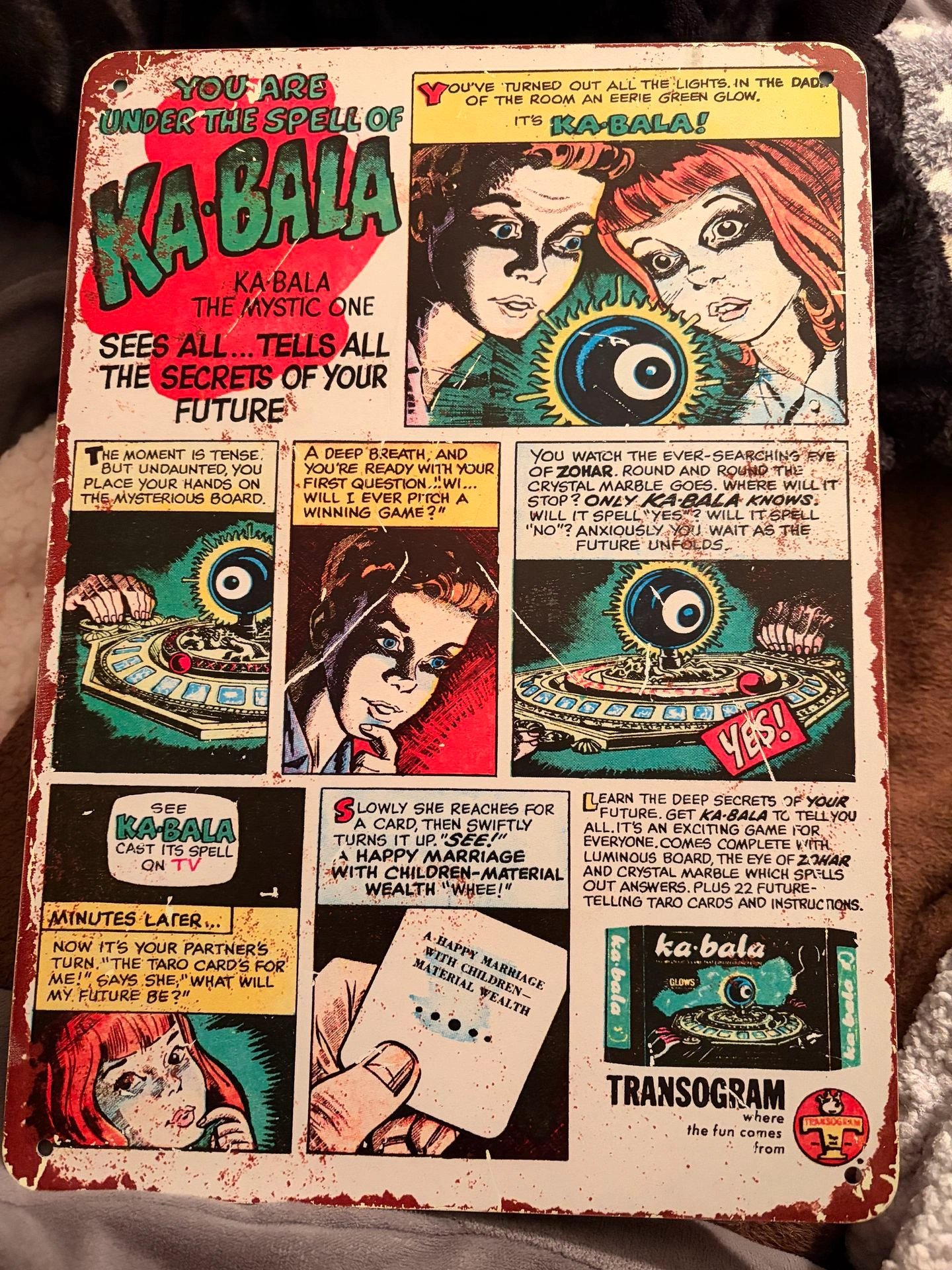 This is a replica of the 1967 Kabala board game, making it a great gift for vintage game collectors. It's a 12" x 16" metal sign with rounded corners and pre-drilled mounting holes for easy wall hanging. Please note: the pictures might make the lettering appear raised, but it is actually flat.