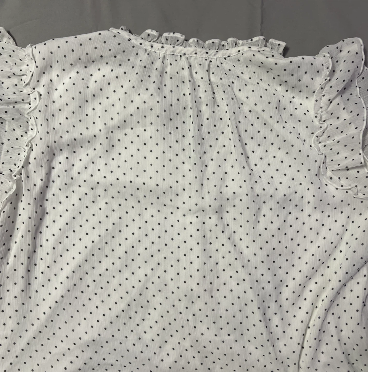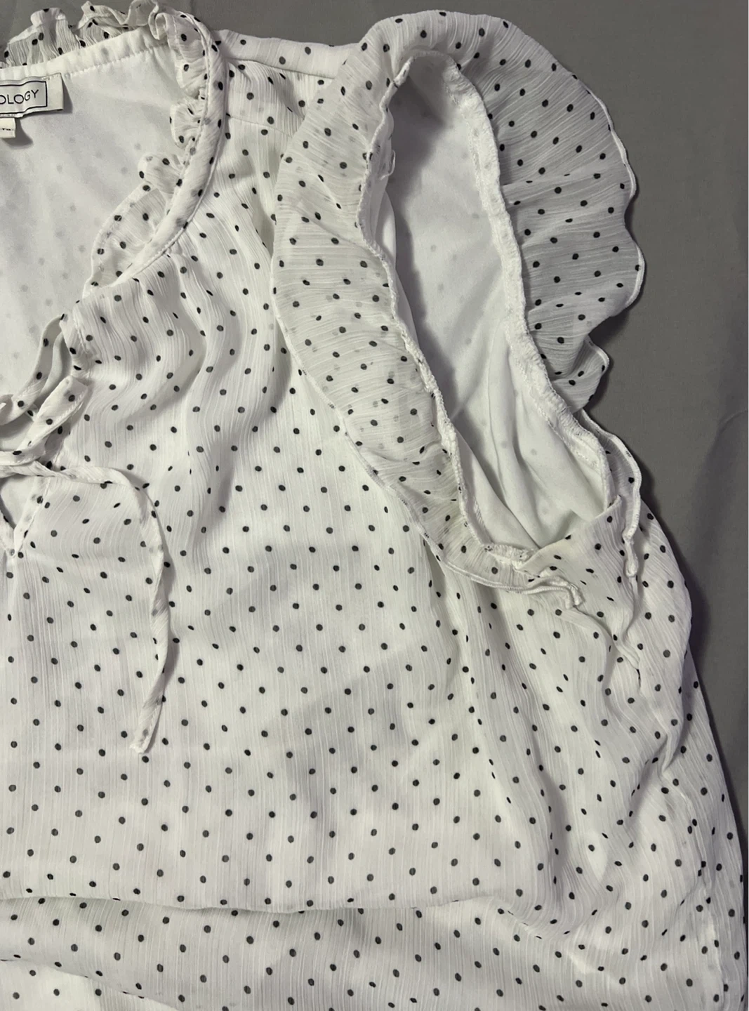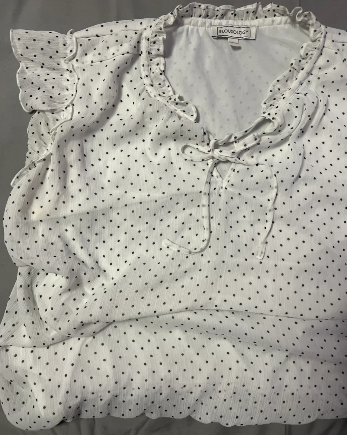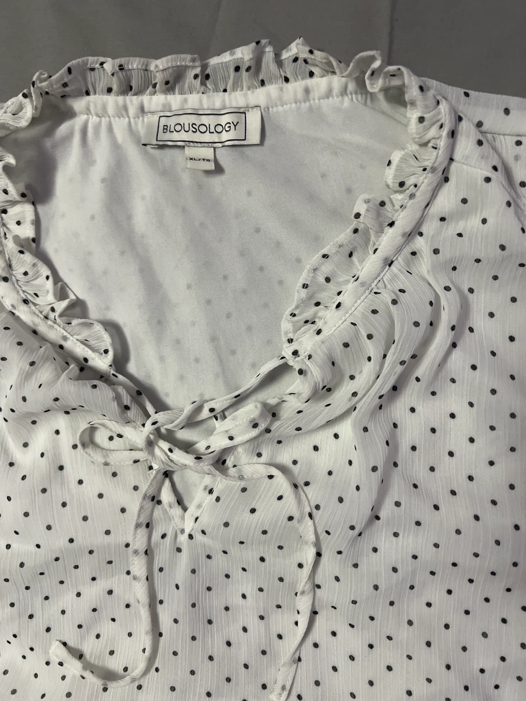 Blousology white chiffon blouse with a black polka dot print. It has ruffle details along the neckline and sleeves, and a tie-front detail. Size XL.