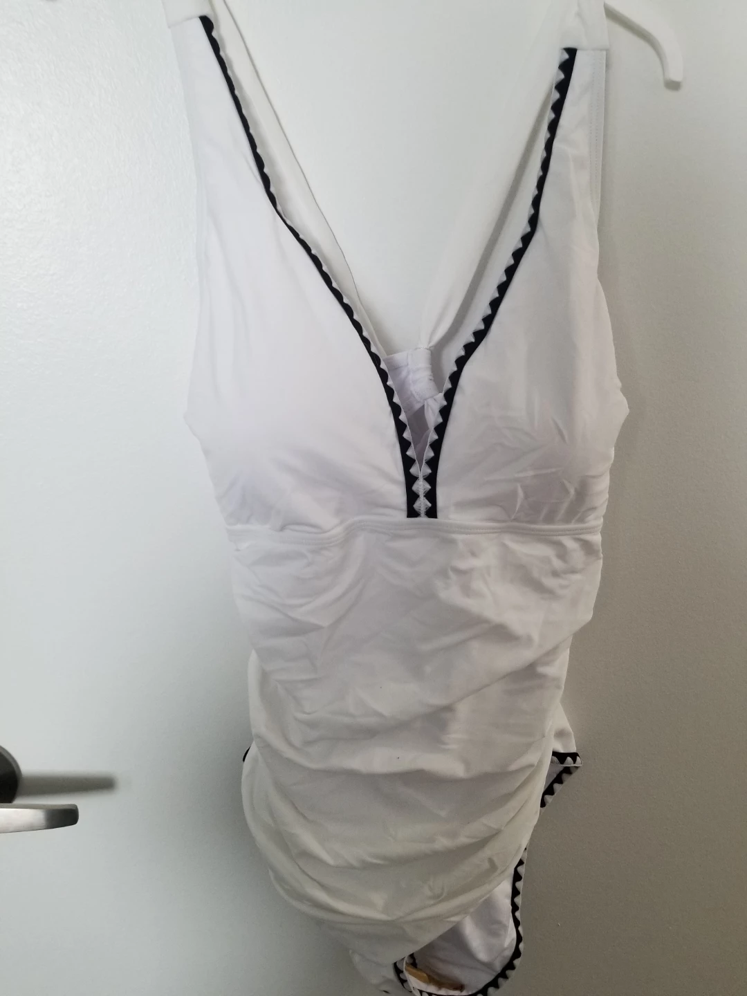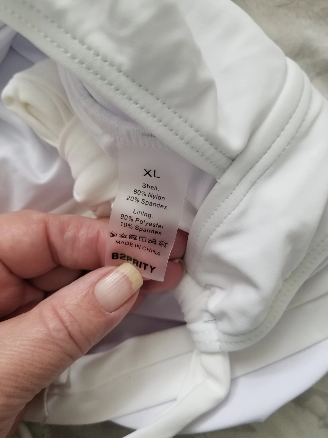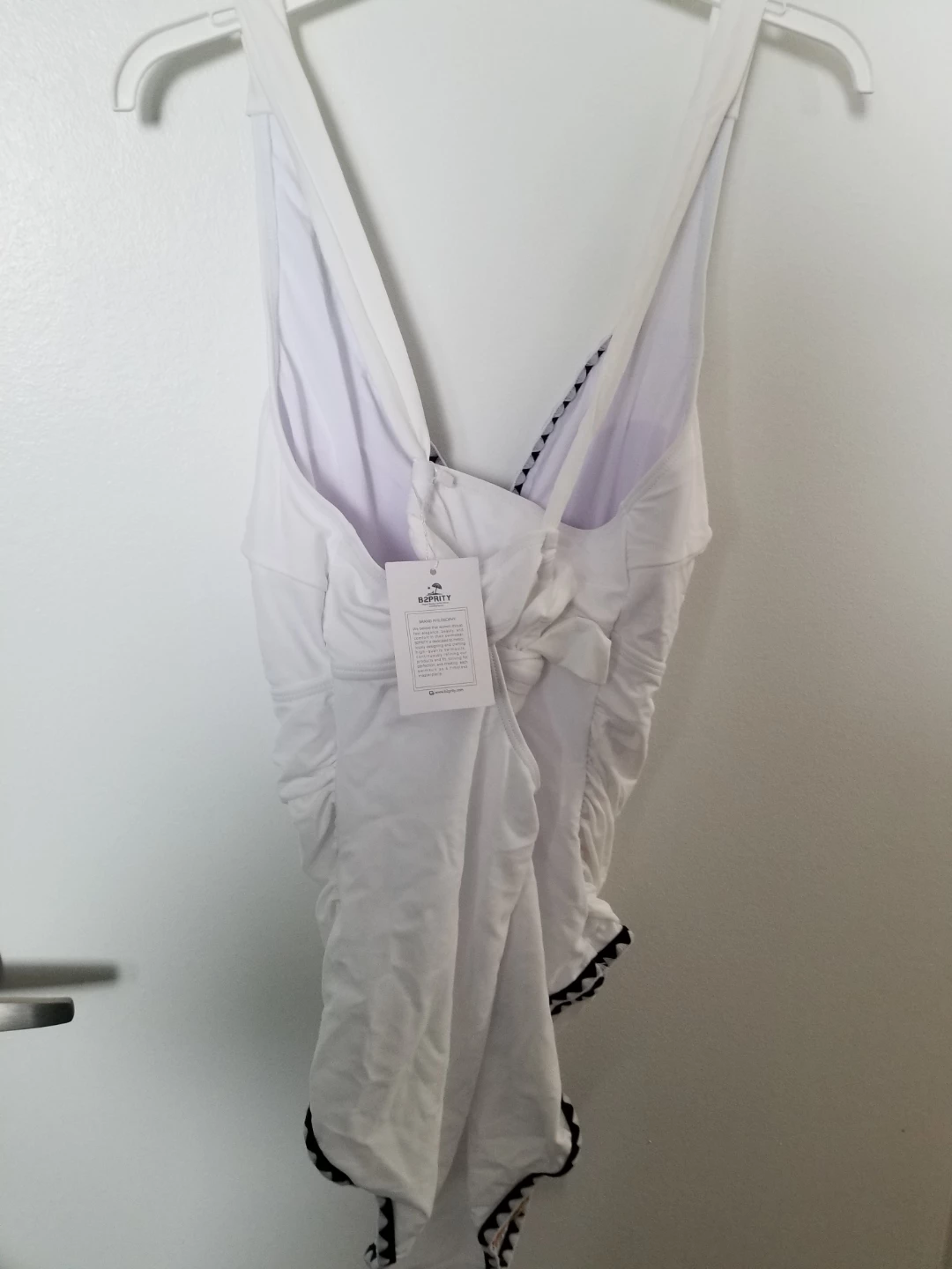 This B2SPRITY one-piece swimsuit is white with black trim. It's size XL. Shell: 80% Nylon, 20% Spandex. Lining: 90% Polyester, 10% Spandex. It's made in China. This suit is ready for summer fun! New with tag