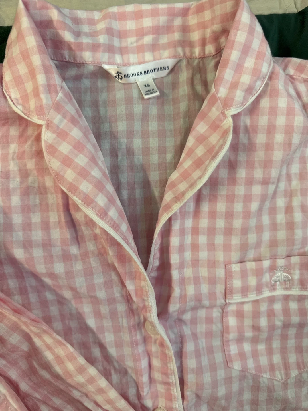 Brooks Brothers women's pajama set in a cute pink gingham pattern. It's a size XS and made from a soft, breathable fabric. Features a button-up top and drawstring pants for a comfy fit.