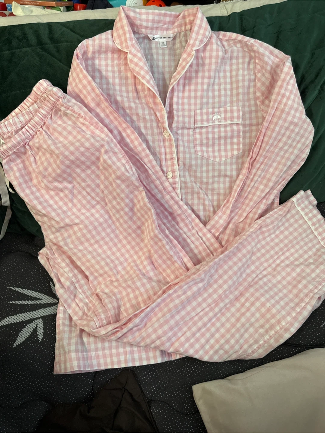 Brooks Brothers women's pajama set in a cute pink gingham pattern. It's a size XS and made from a soft, breathable fabric. Features a button-up top and drawstring pants for a comfy fit.