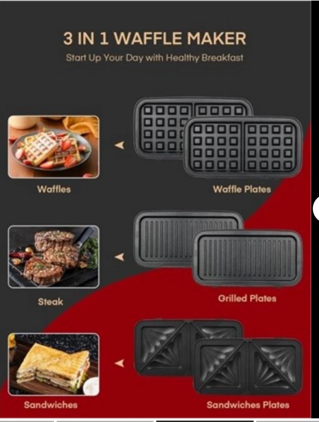 Multi-Function 3 removable grill plates (sandwich, waffle and grill plates) , it can not only be used as a waffle maker, but also be used as a sandwich maker or panini maker, helps to DIY foods, such as grill cheese, barbecue steaks, tomatoes, vege.