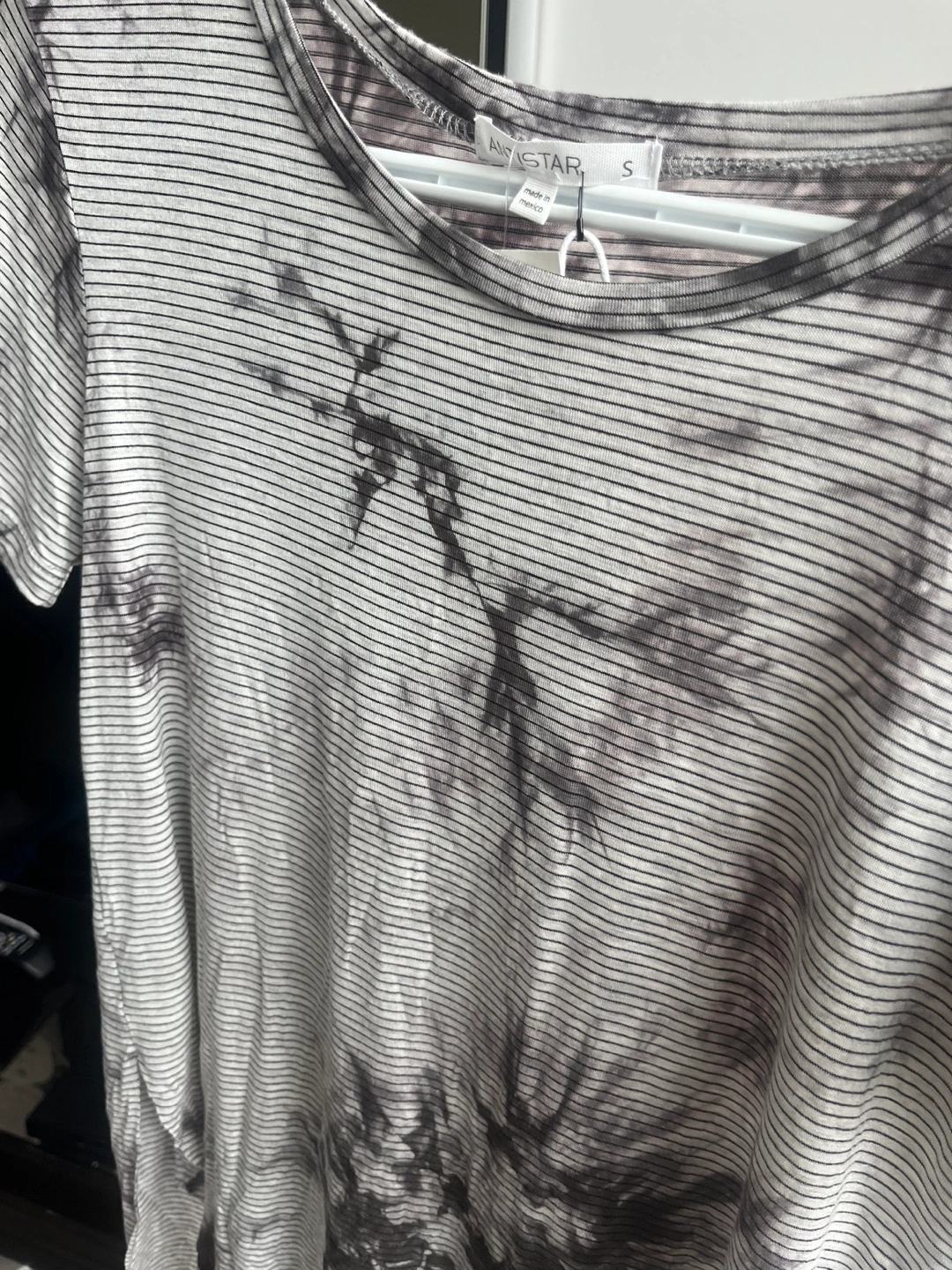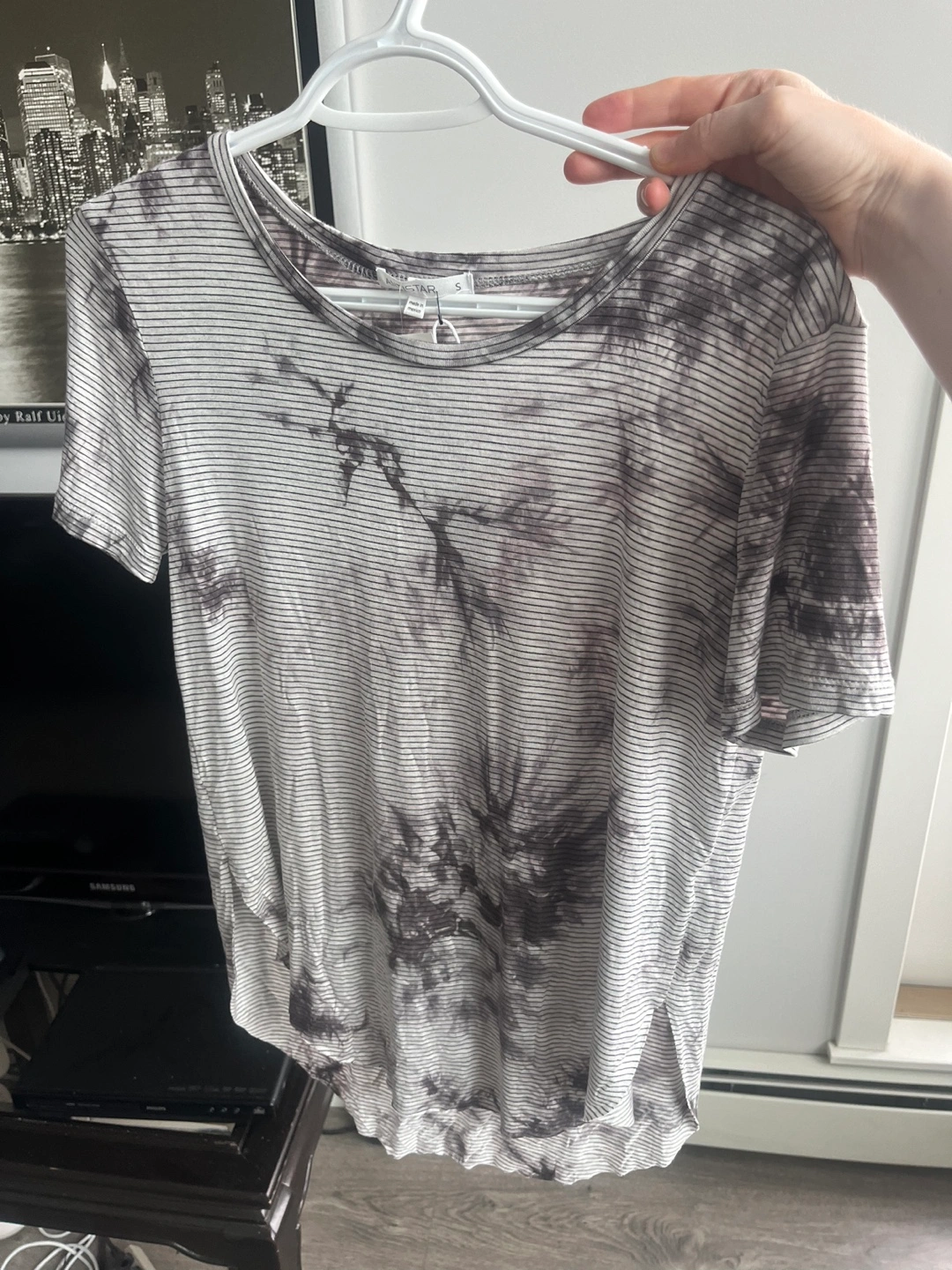 Women's size small shirt. Grey and white tie-dye pattern with thin stripes. Short sleeves and a curved hemline. Very Soft and comfortable/ stretchy fabric.
