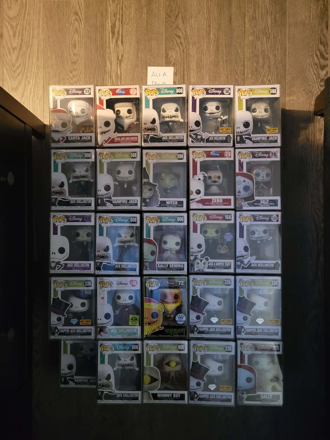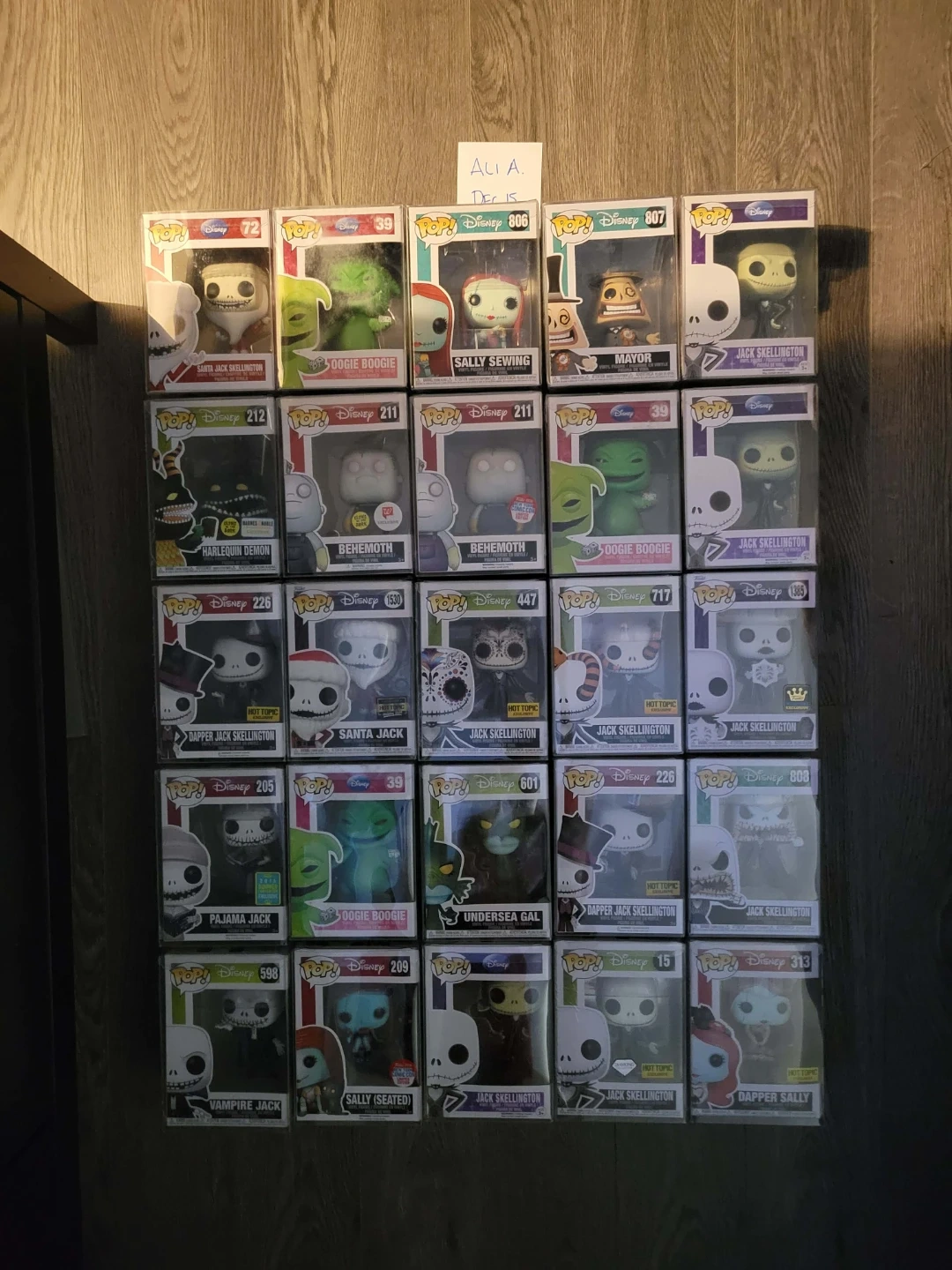 This is a large collection of Funko Pop! figures from Tim Burton's The Nightmare Before Christmas. It includes characters like Jack Skellington, Sally, Mayor, Oogie Boogie, and more. Figures are in their original boxes.