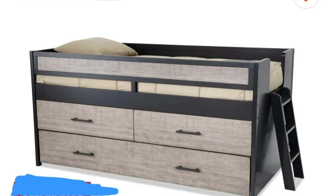 This twin loft bed features a stylish design with two drawers and a pull-out trundle. It's constructed with durable materials and includes a ladder for easy access. Perfect for saving space in a bedroom! Two twns mattress. Never used