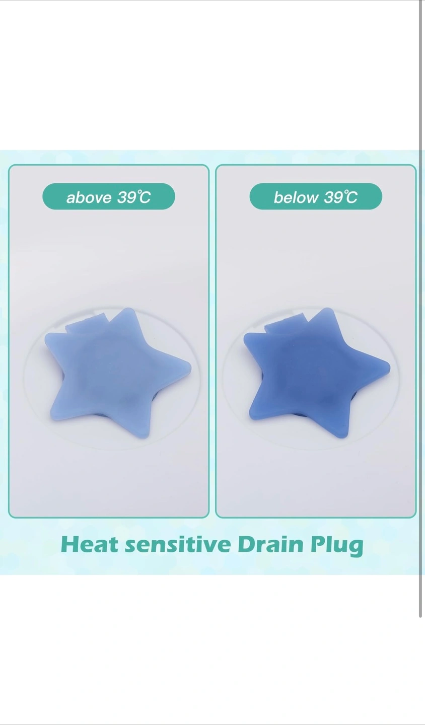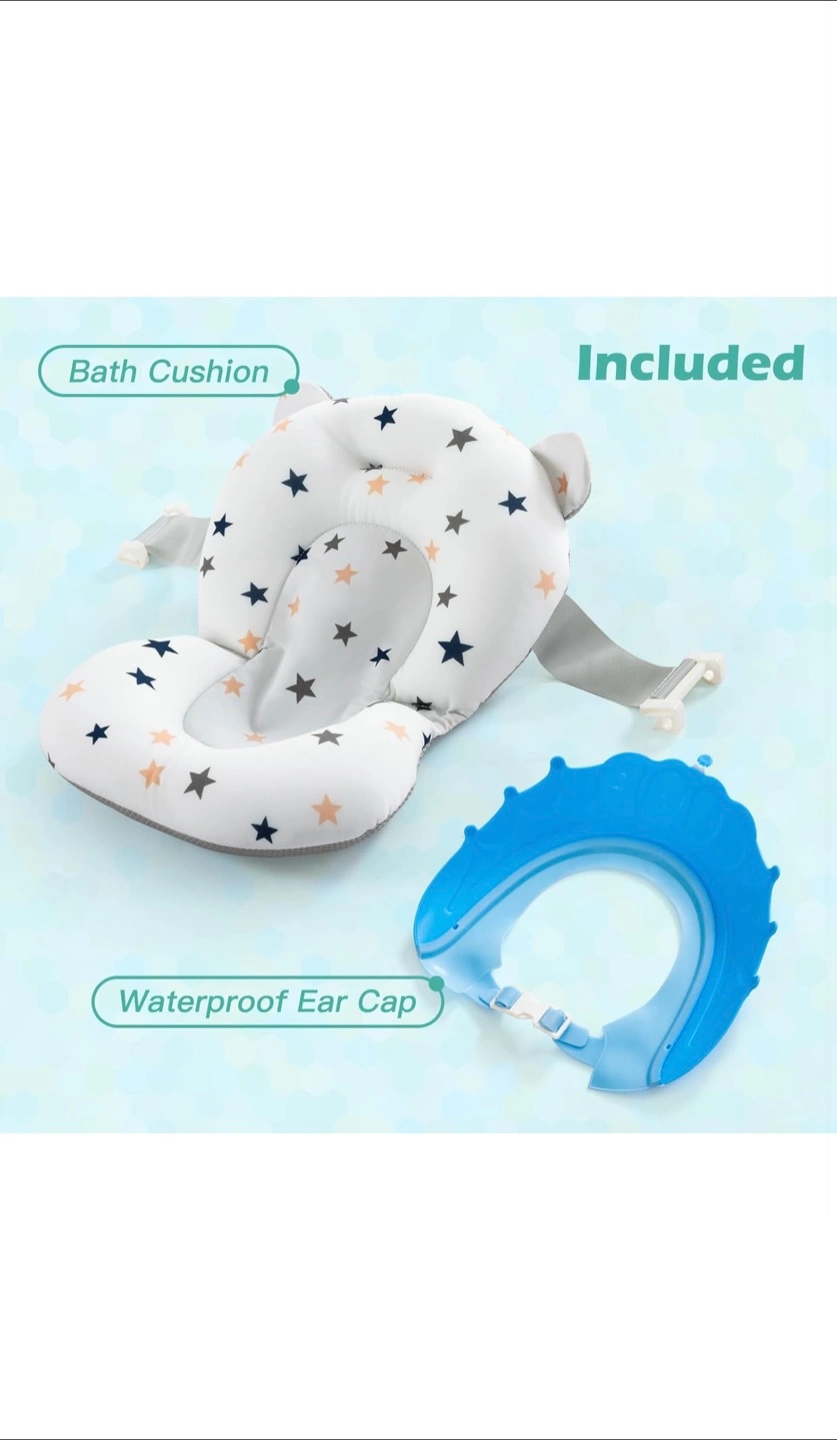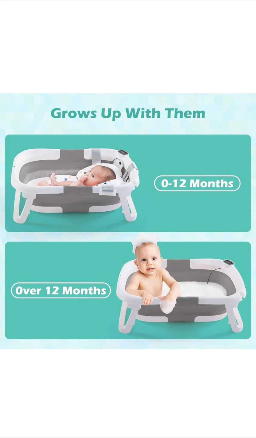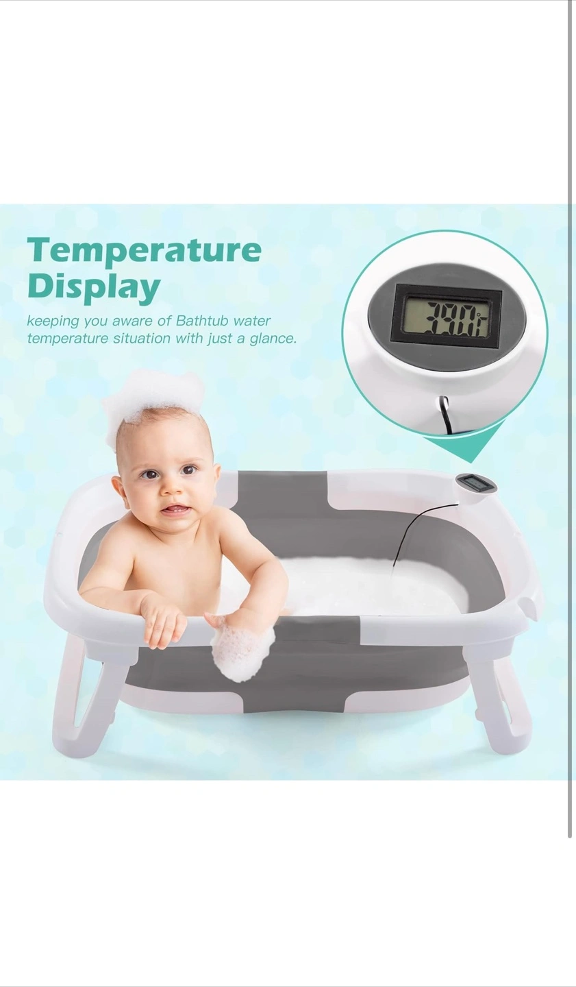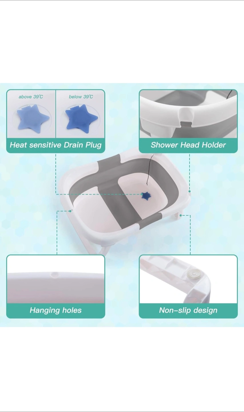 Infant bathtub, folds for storage. Includes heat sensitive drain plug, shower head holder, non-slip feet, hanging holes. Suitable for newborns to toddlers. Features temperature display, bath cushion, and waterproof ear cap. Grey and white.