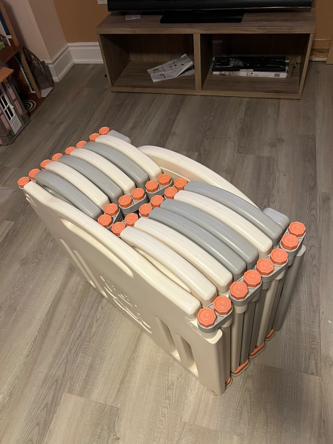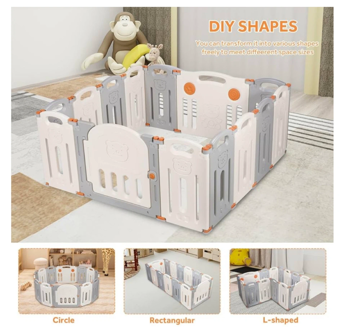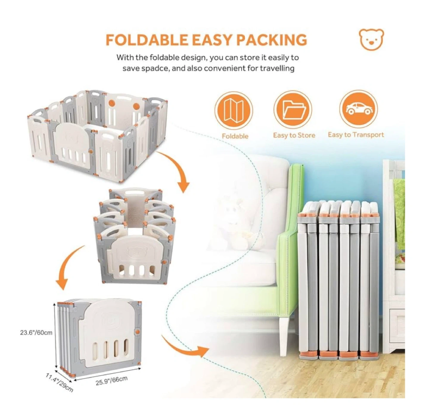 This foldable baby playpen is perfect for keeping your little one safe and entertained! It's designed for easy packing, so you can store it conveniently or take it with you when travelling. The playpen can be transformed into various shapes to fit different spaces, such as a circle, rectangle, or L-shape. Dimensions when folded are approximately 23.6"/60cm x 11.4"/29cm x 25.9"/66cm