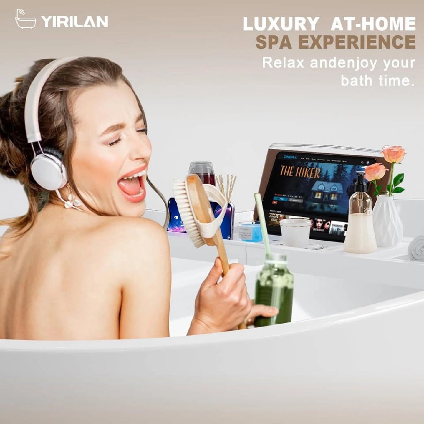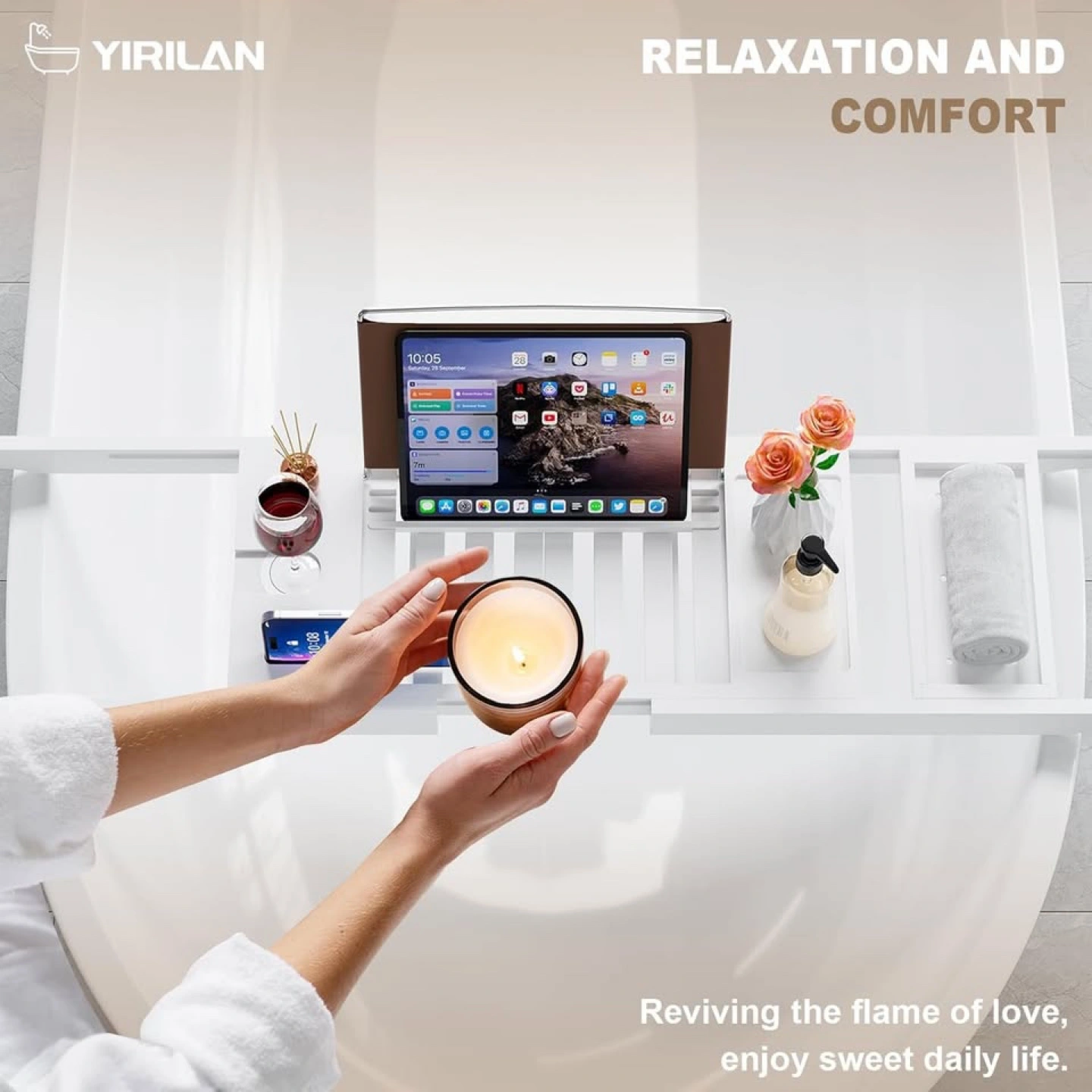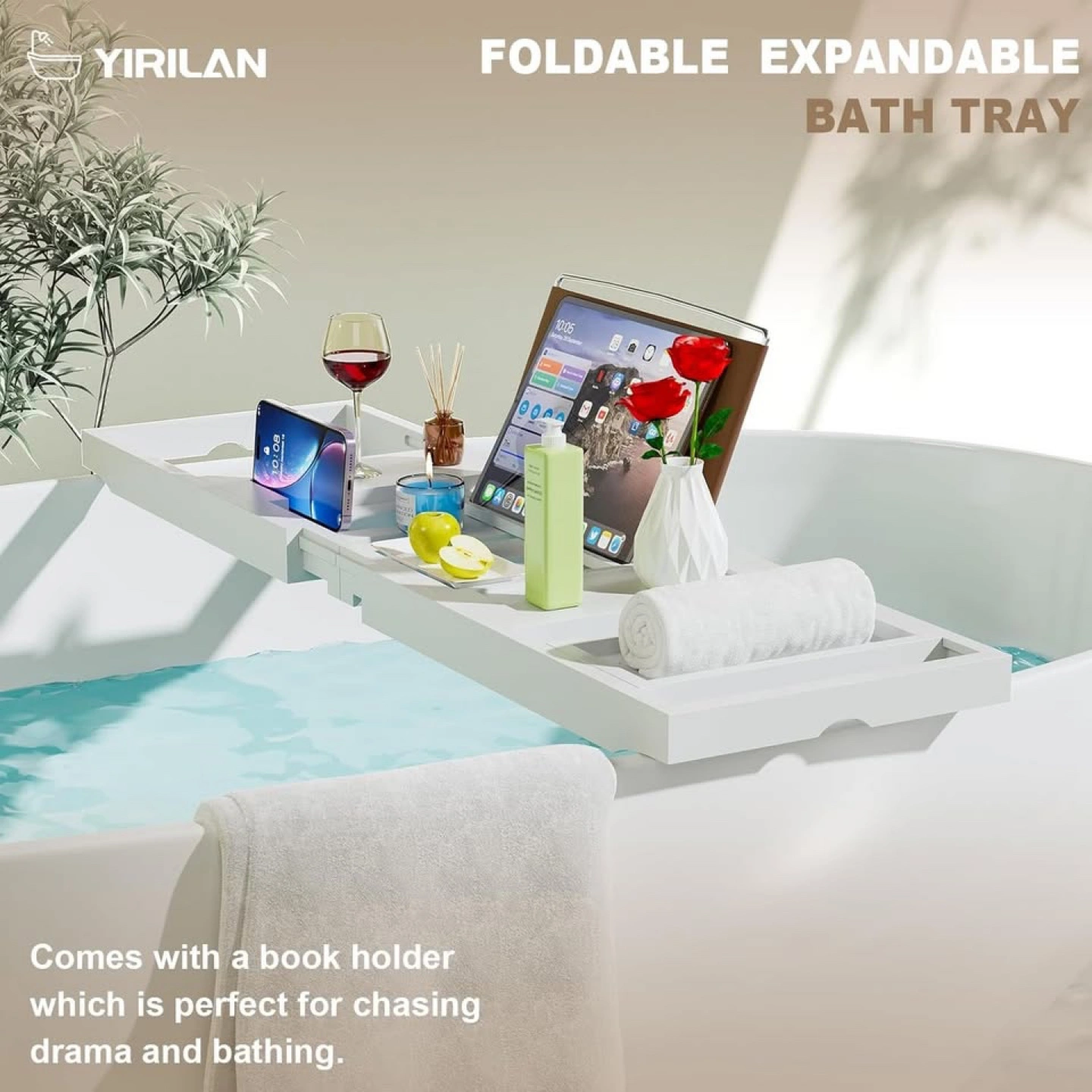 NEW IN BOX About this item ADJUSTABLE AND EASY TO USE: The Yirilan bathtub tray is retractable and adjustable to fit any size bathtub. The multiple functional positions can hold wine glasses, tablets, mobile phones, and various flowers and fruits, allowing you to easily enjoy your bathing experience EASY TO STORE, WATERPROOF, AND HIGH-QUALITY BATHROOM TRAY: Made from selected bamboo wood and treated with waterproof paint, the Yirilan bath tub tray is both durable and water-resistant. It can be folded and retracted for easy storage, and can be easily wiped clean with a towel. This high-quality bathroom tray ensures that you will have the best bathing time possible RELAX YOURSELF WITHIN BATH TIME: After a long day, treat yourself to some well-deserved me-time with our expandable bamboo bath tray. Designed to fit either a solo dip or a romantic soak for two, this tray is perfect for transforming any bath into a spa-like retreat PERFECT GIFT IDEA: The Yirilan bathtub tray is the perfect gift for any occasion, including housewarmings, weddings, birthdays, and Christmas. Give the gift of luxury and relaxation to your loved ones SATISFACTION GUARANTEED: We promise to provide you with customer service satisfaction. If you have any questions, please contact us in time, and we will solve the problem for you within 24 hours, serving every customer with heart