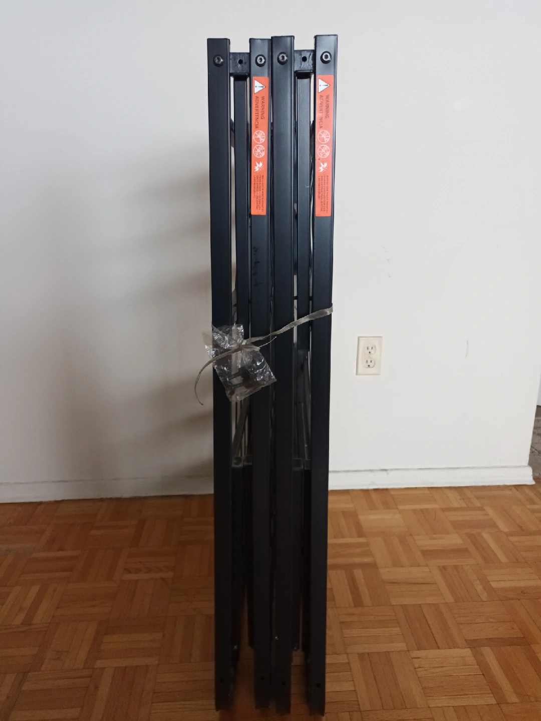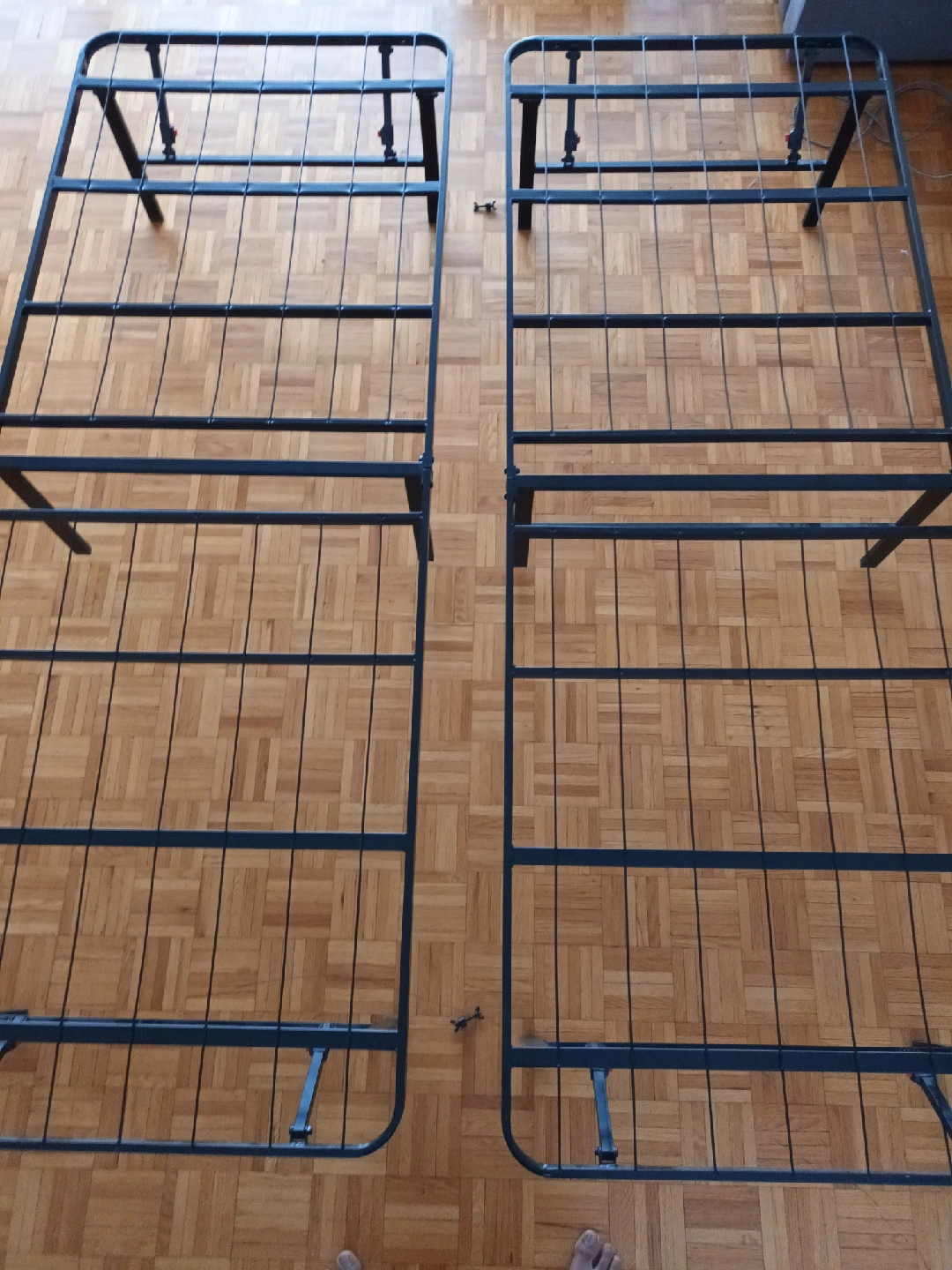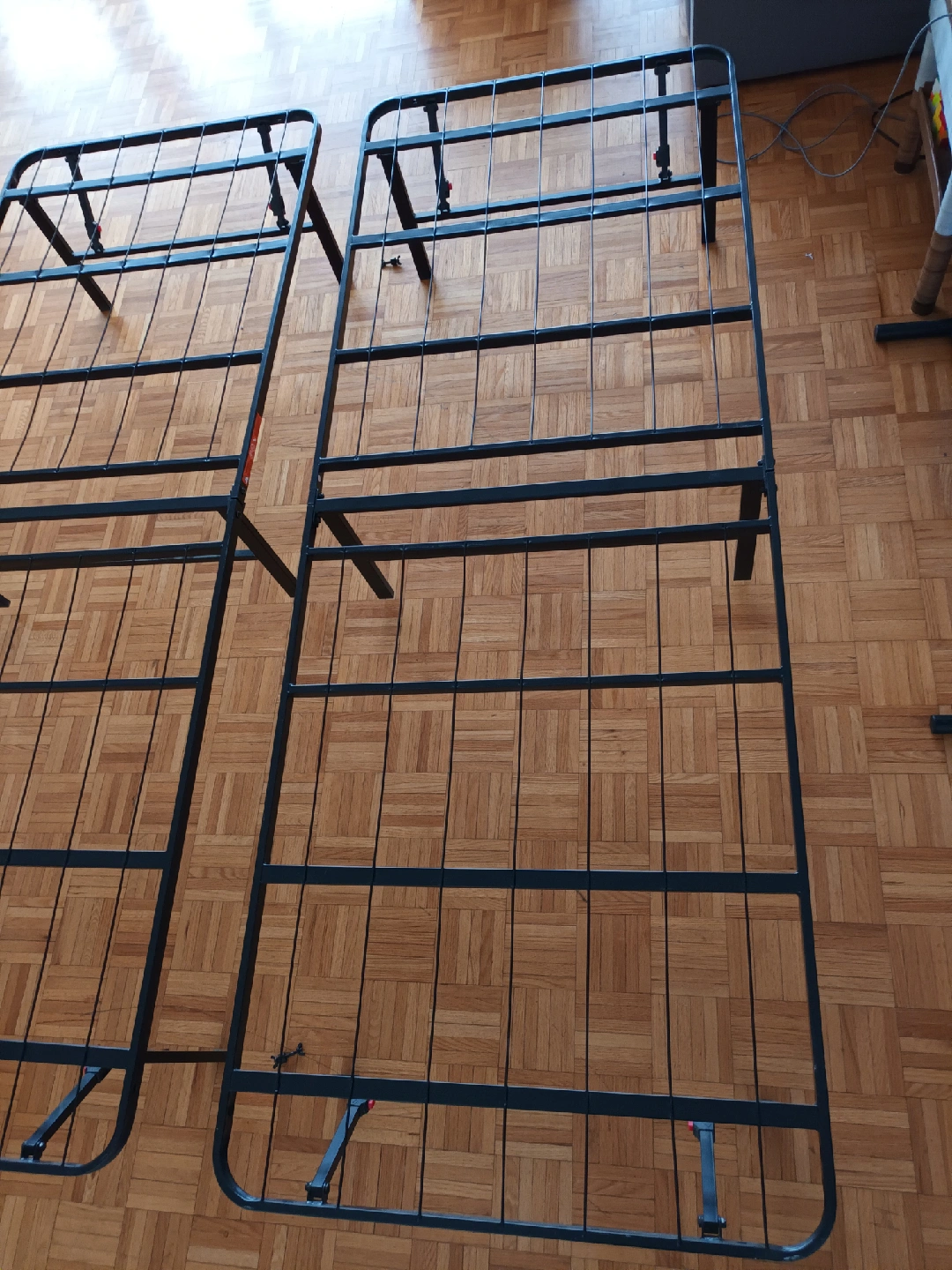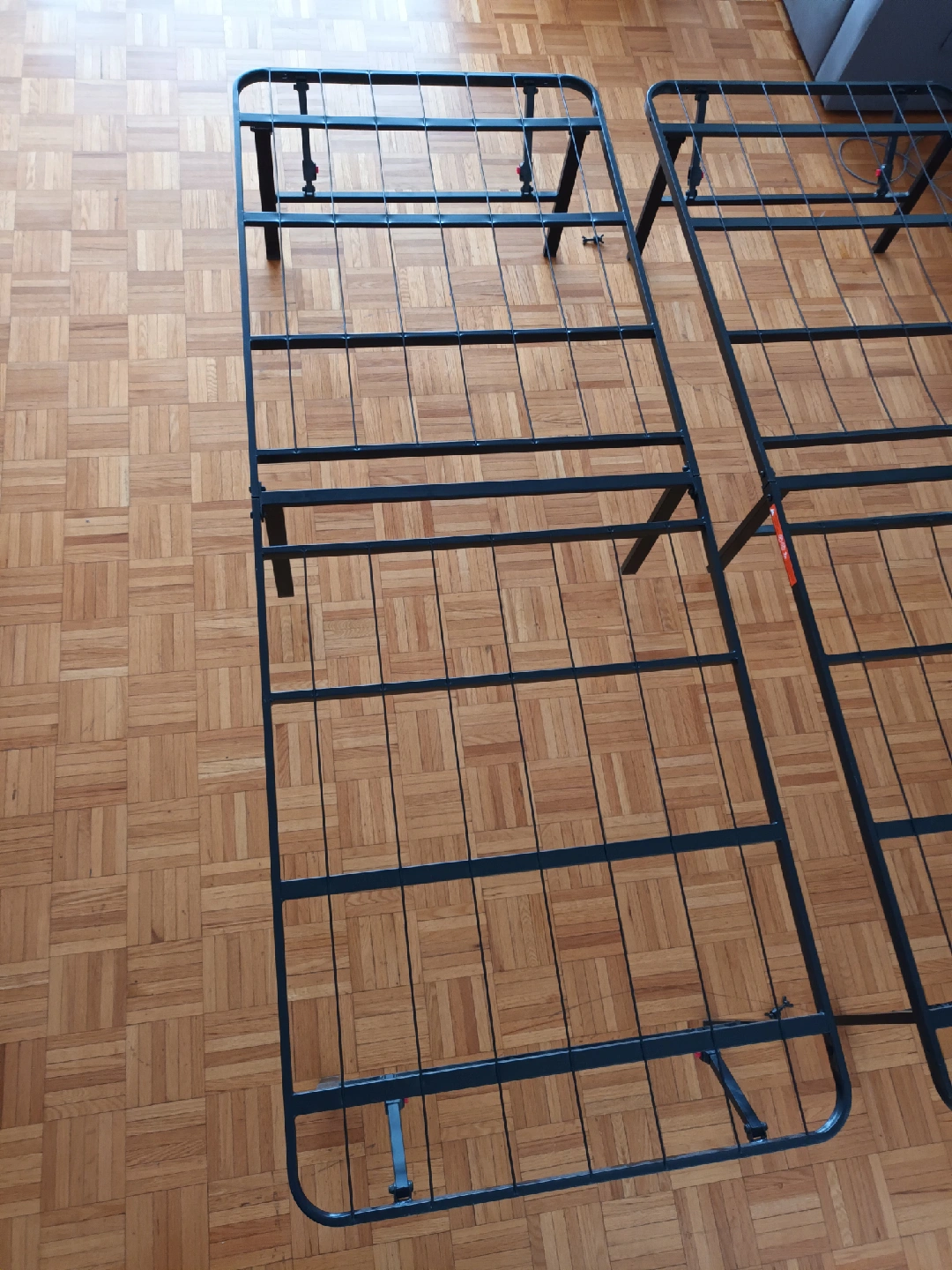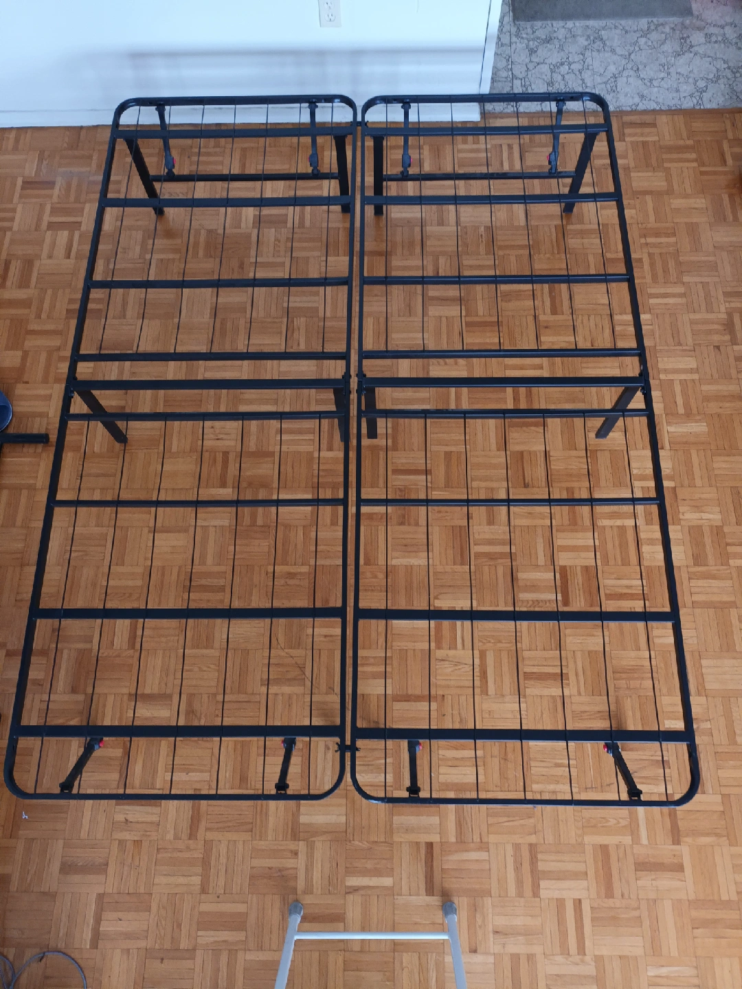 60*Condition: Almost new *Smoke-free, Pet-free home *No tools required for assembling *Colour: Black *Size: Queen *Dimensions (approx): Length 80" (203.2 cm); Width 60" (152.4 cm); Height 14" (35.5 cm) Notes for collecting the bed frames: *Each bed frame weighs approx 10 kgs *When both are folded and held together (shown in one of the images), they will need a space of 40" × 30" × 6"