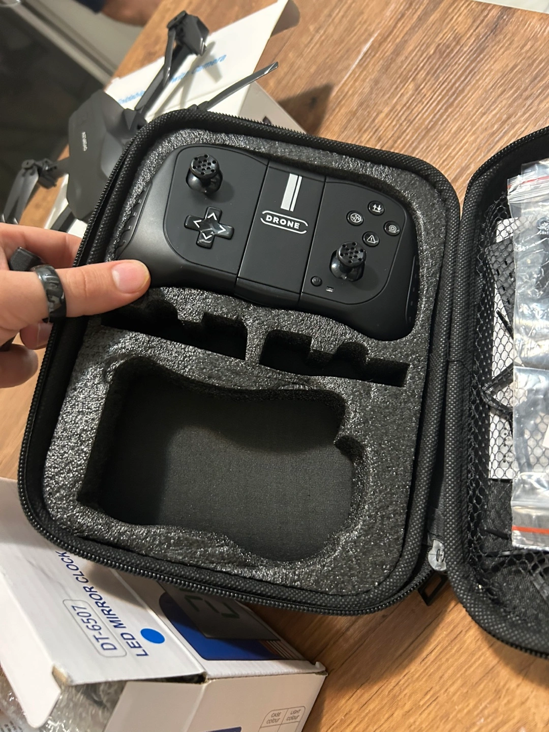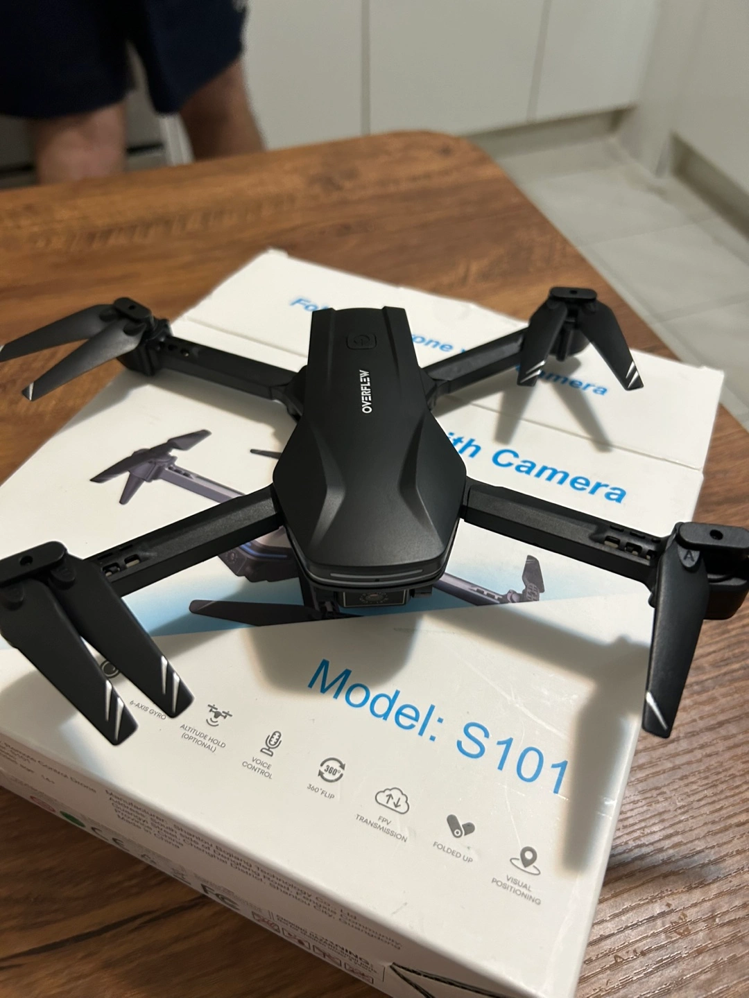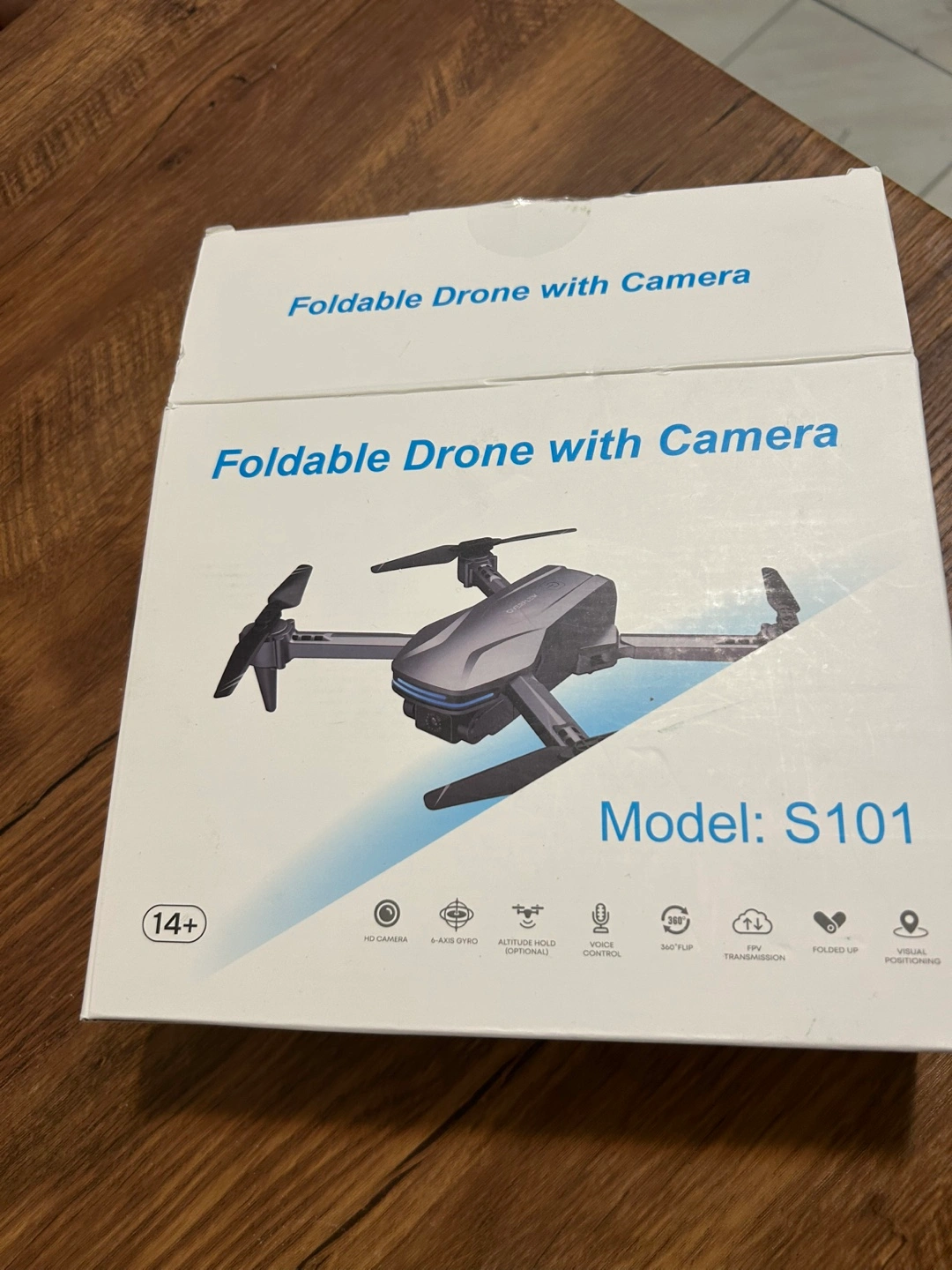 Selling a foldable drone with a camera. It includes a remote controller and comes with its original box. The model is S101.