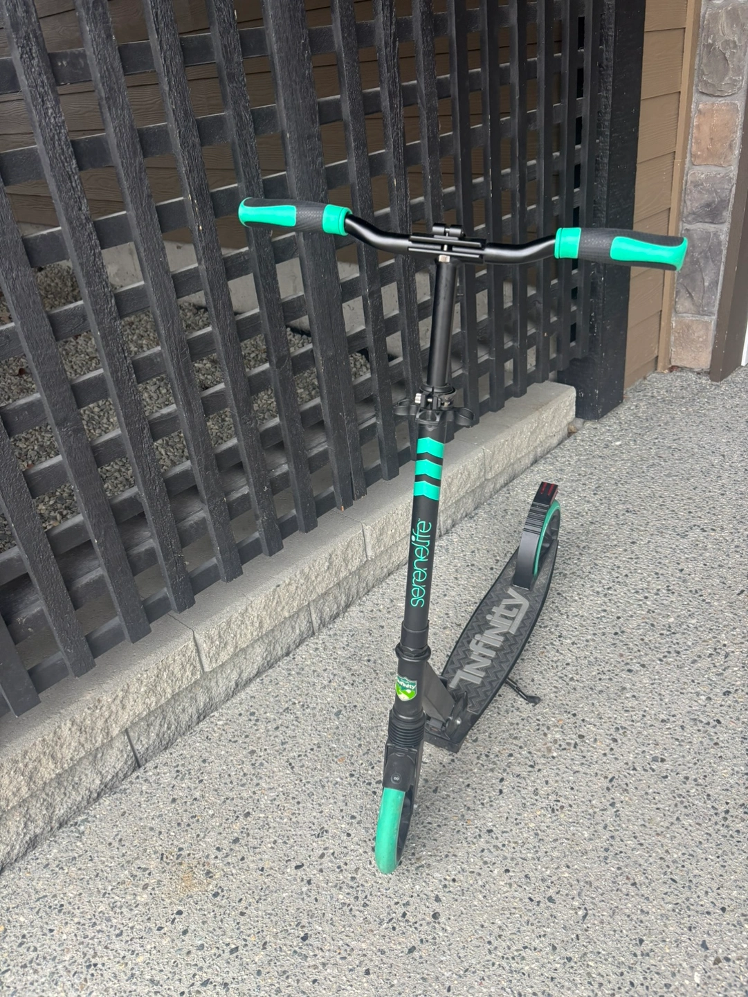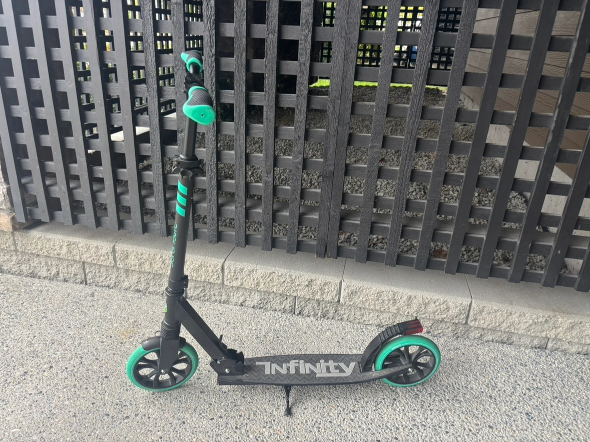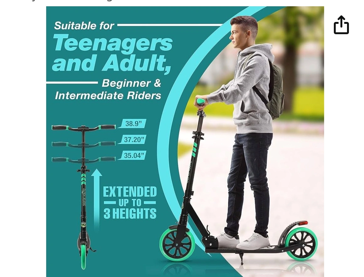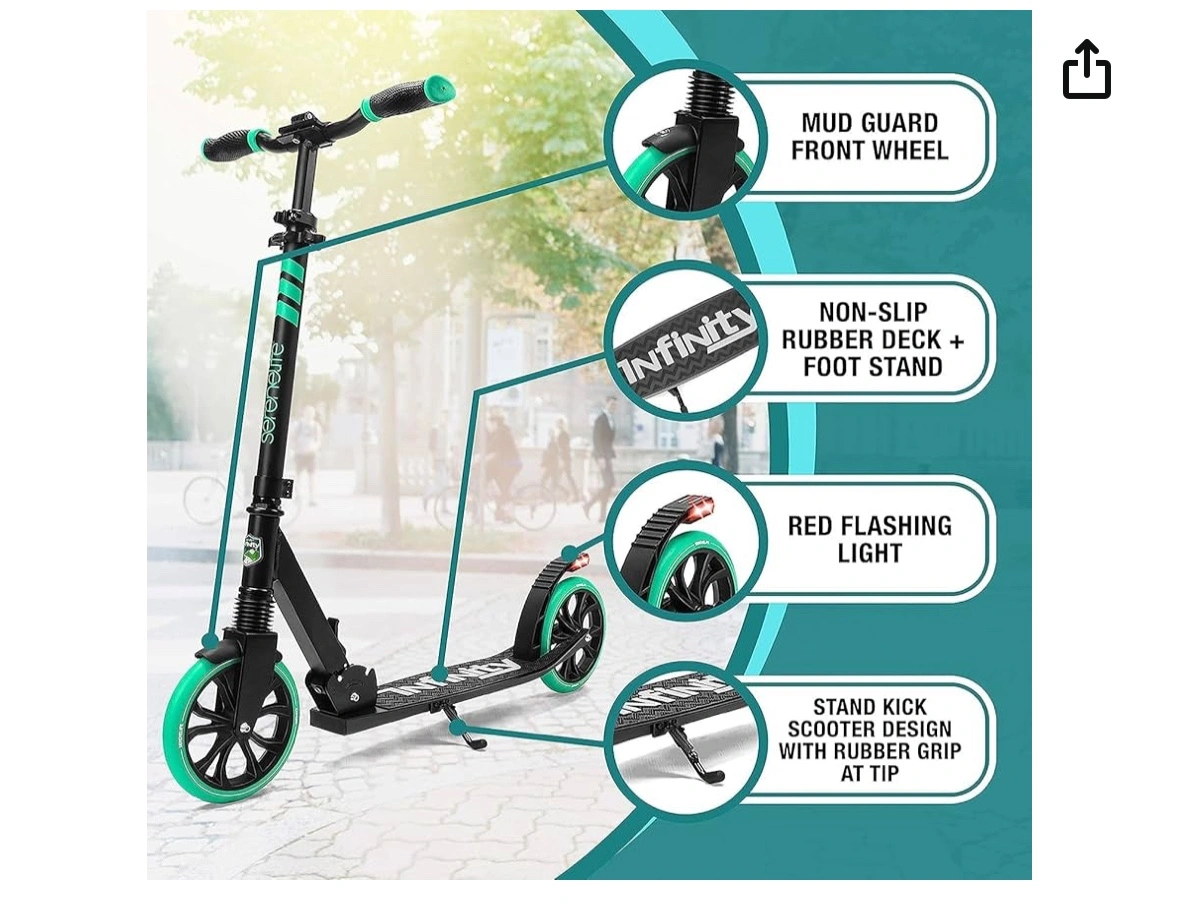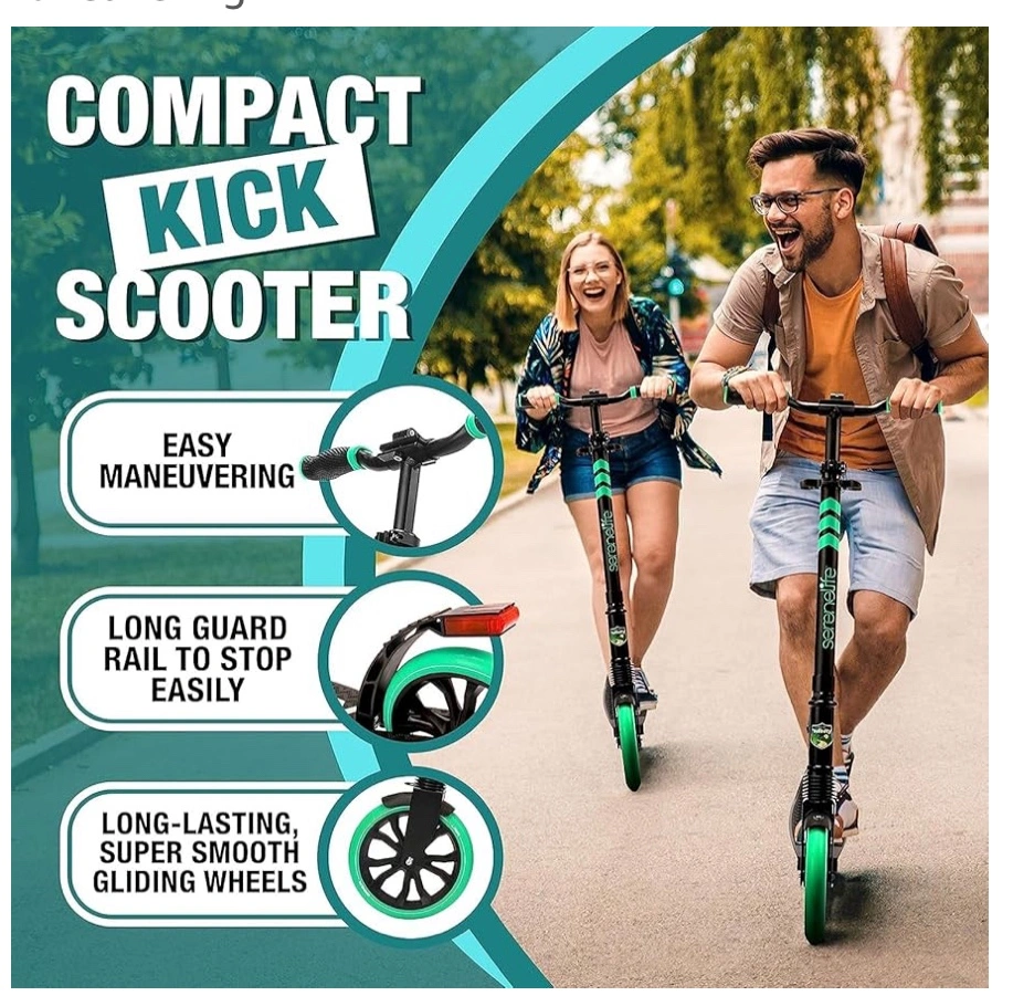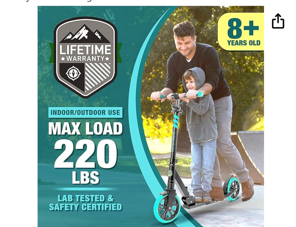 This scooter is great for both indoor and outdoor use and can be used by both teenagers and adults. It has a maximum load capacity of 220 lbs. It has a non-slip rubber deck and a foot stand. The scooter also has an adjustable T-bar handlebar height. The scooter is easy to manoeuvre and has a long guard rail to stop easily. The scooter is made with long-lasting, super smooth gliding wheels. It has a red flashing light and a mud guard front wheel. The scooter is safety certified and has a lifetime warranty. It folds for easy storage.