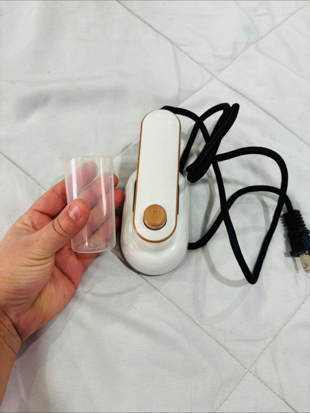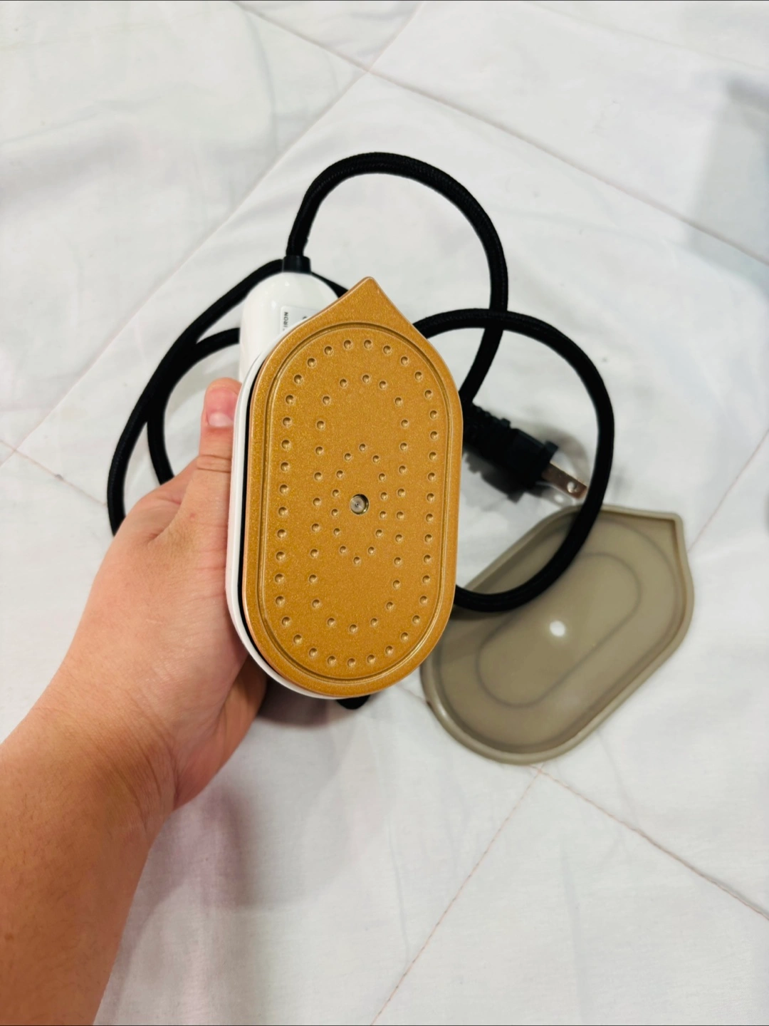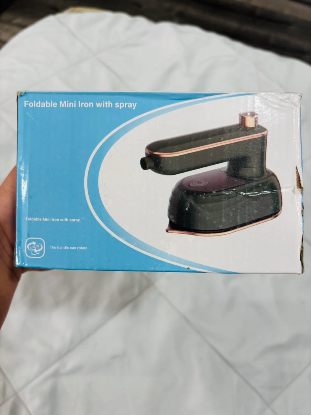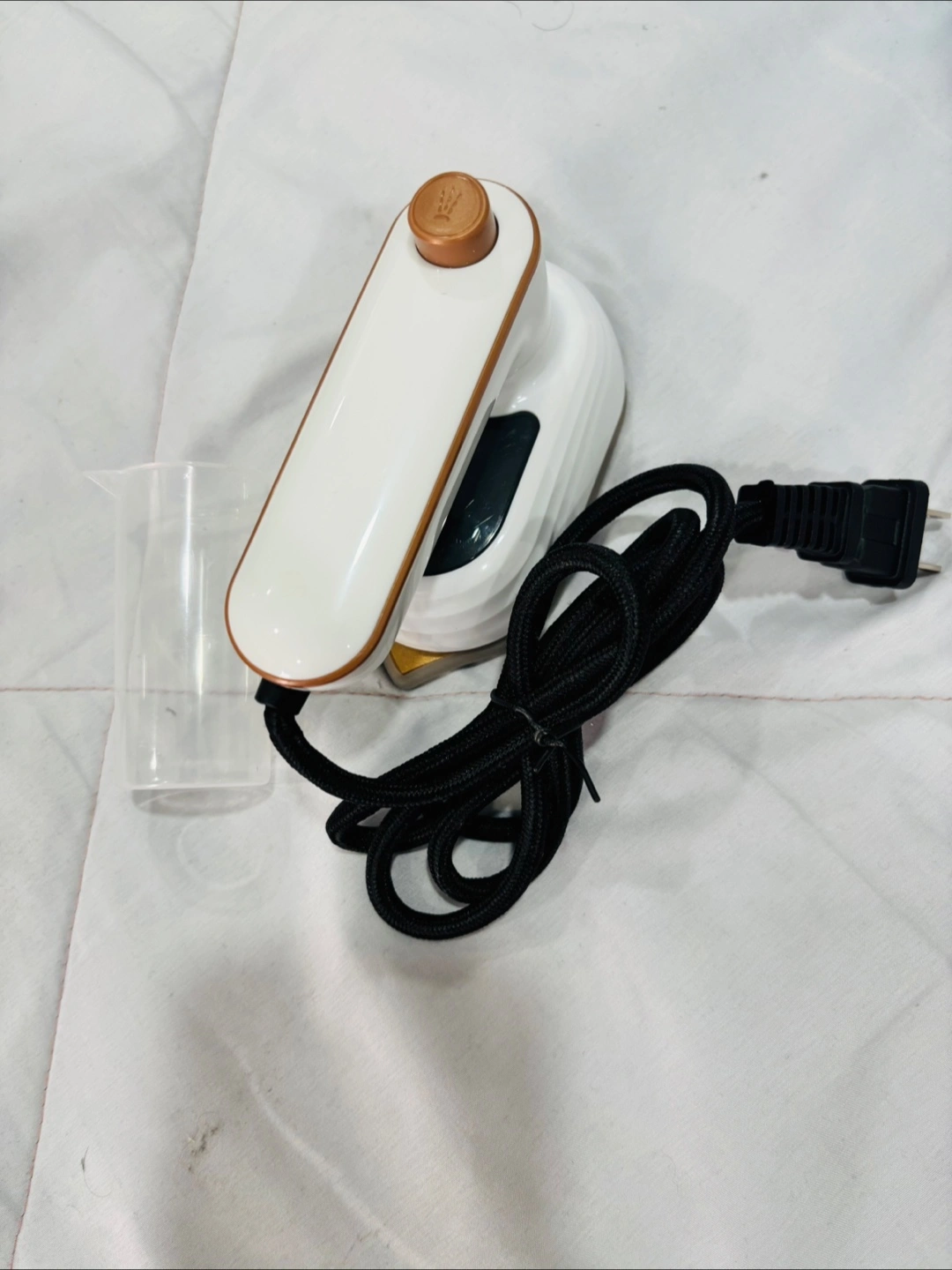 Selling a foldable mini iron with spray! It's super handy for travel or quick touch-ups. The handle rotates for easy use, and it comes with a water cup for the spray function. Never used.