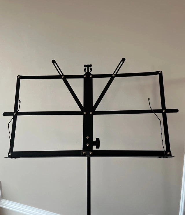 91Elevate your musical performances with this sturdy and adjustable black metal music stand, perfect for musicians of all levels. This stand has been previously enjoyed, but is still in good working order. It is ready to hold your sheet music securely, whether you're practicing at home or performing on stage. Additional features include: * Adjustable height to suit your needs. * Durable metal construction for long-lasting use. * Lightweight and portable design. * Folds for easy storage and transport. If you're seeing this ad, the music stand is still available.