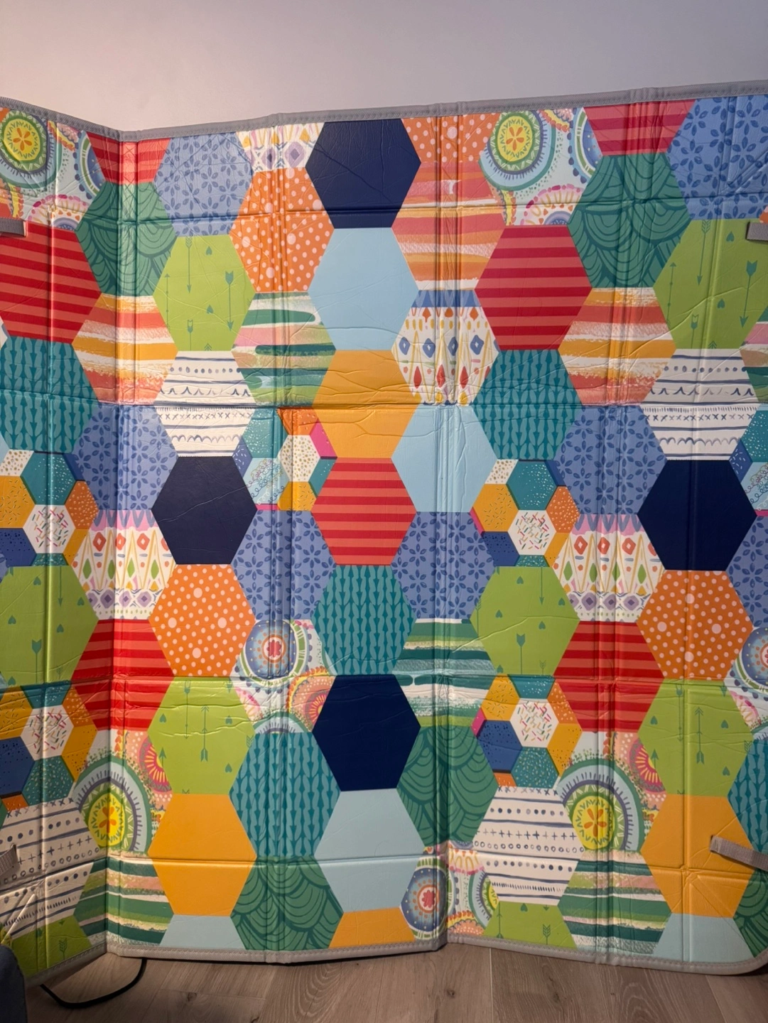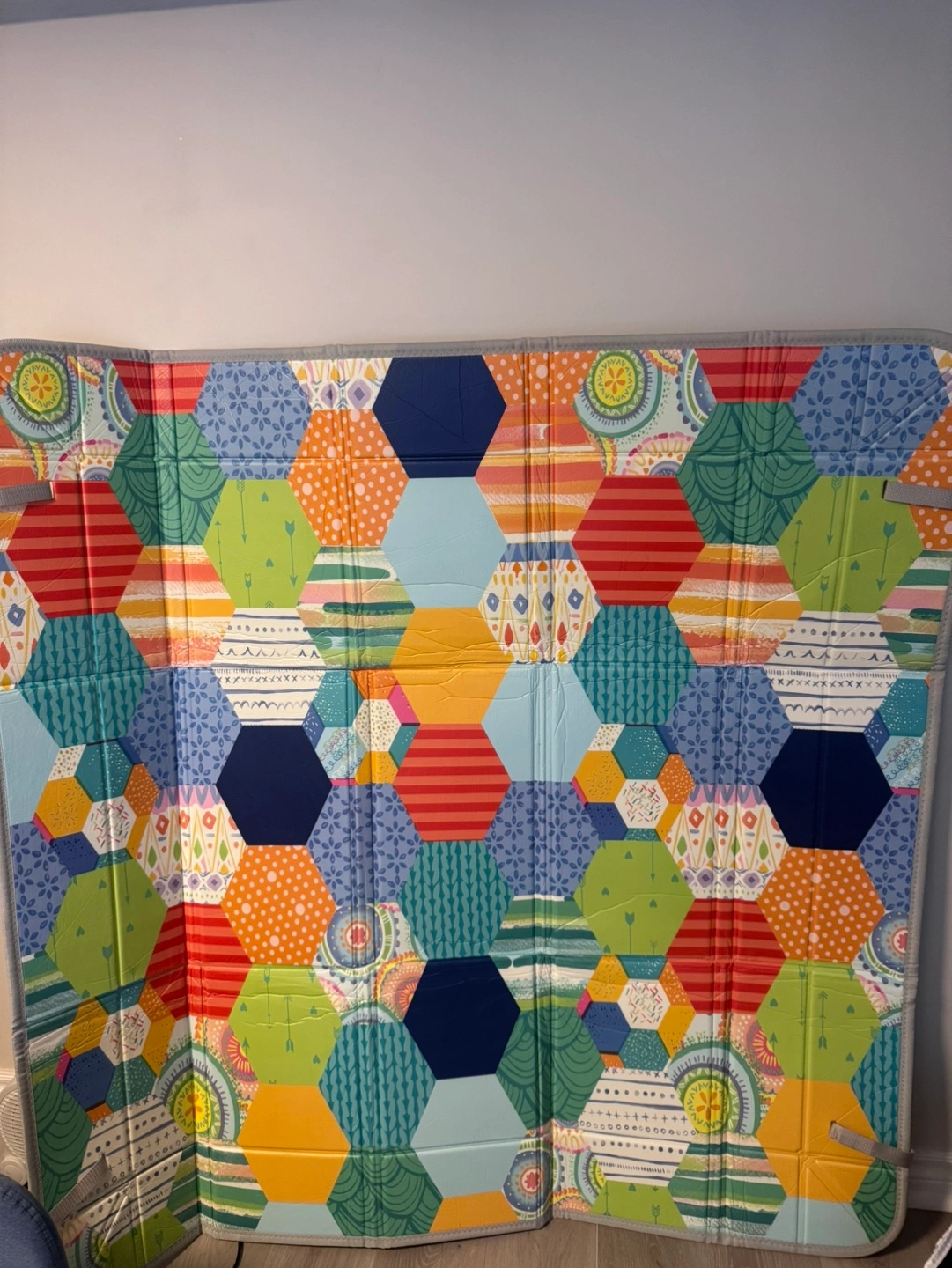 187Portable and foldable picnic blanket. Features a vibrant, colourful patchwork design. Perfect for outdoor use. Folds easily for convenient storage and transport.