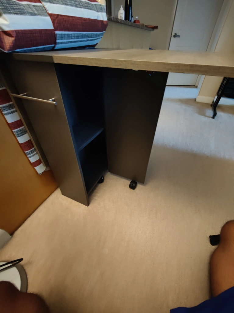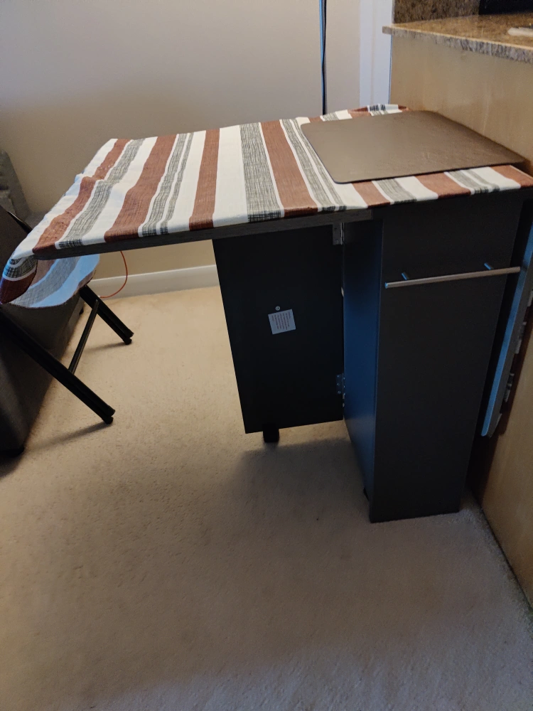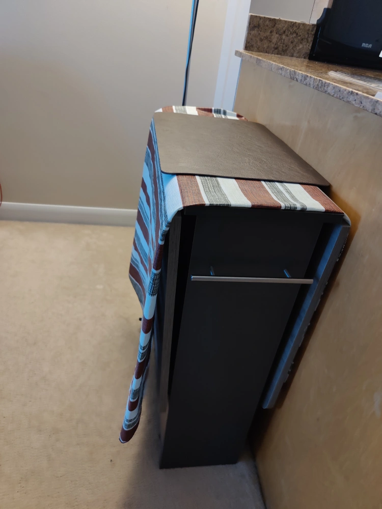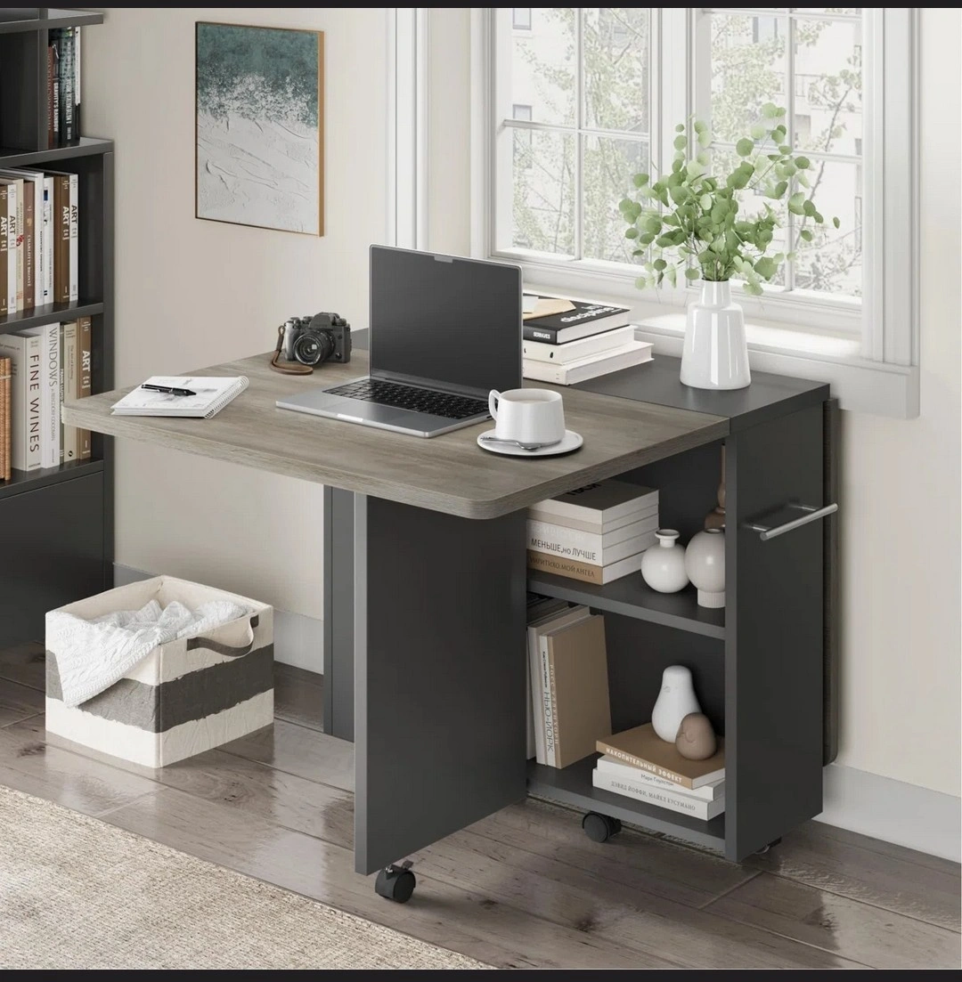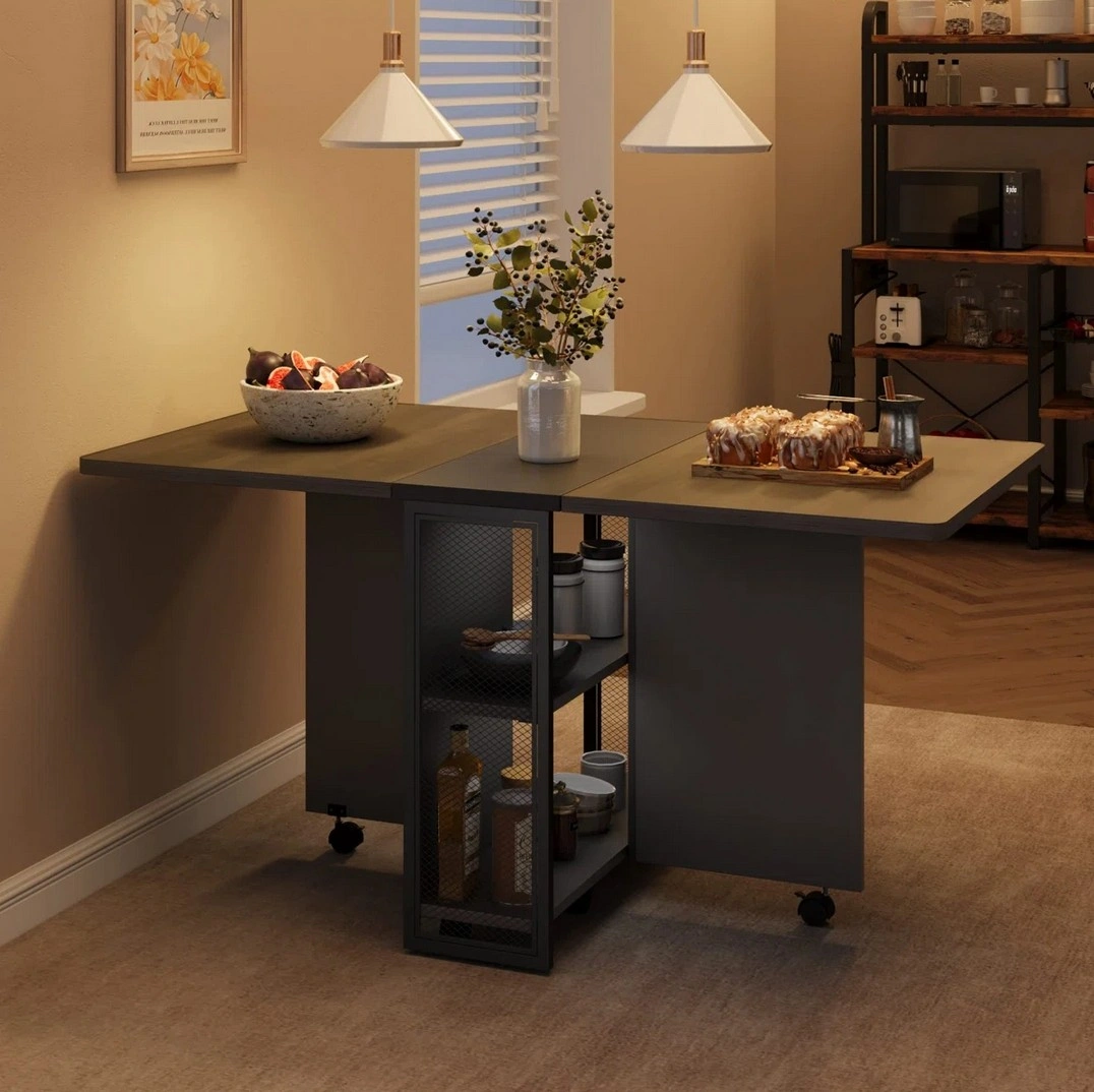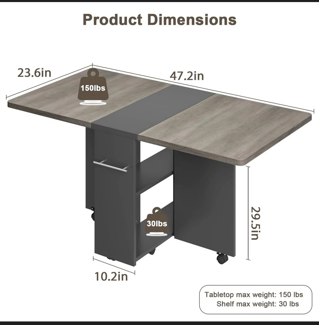 New Wayfair Dining Table. All original pieces in the box, never been assembled. I got another one. can be used as kitchen island too. NOTE: One of the side flaps has a chip to it. See photo. If you have tools you can sand it or put a plastic on it. Otherwise fully functional. This folding drop leaf dining table is a versatile addition to any small space! It features a drop leaf design, storage shelves, and convenient wheels for easy mobility. Size : 29.50" H x 23.60" L x 47.20" D Colour : Charcoal Grey/Black Pickup only.