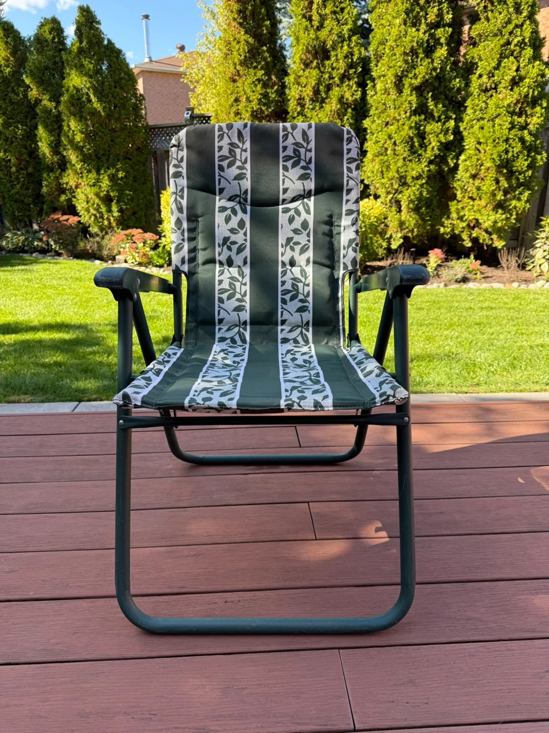 Selling a folding camping chair in good condition! It features a green frame and a comfortable seat and backrest with a green and white leaf pattern. Perfect for relaxing outdoors, camping, or just enjoying your backyard! Cash only and pick up in Mississauga. All sales final and bundle offers are welcome. A freebie with every purchase is included.