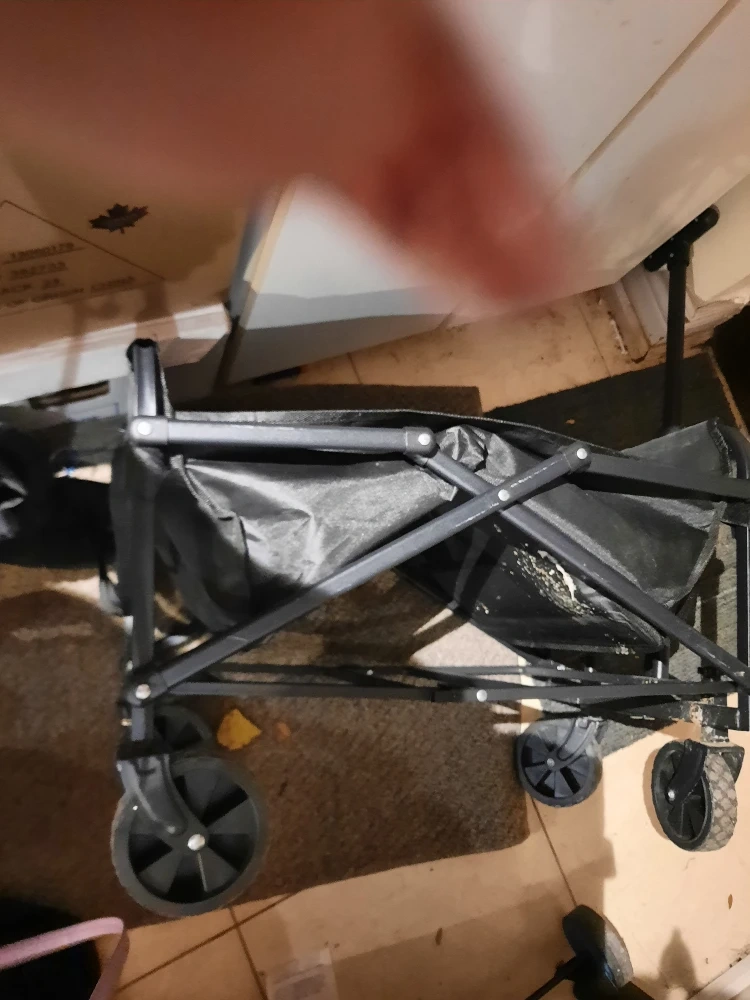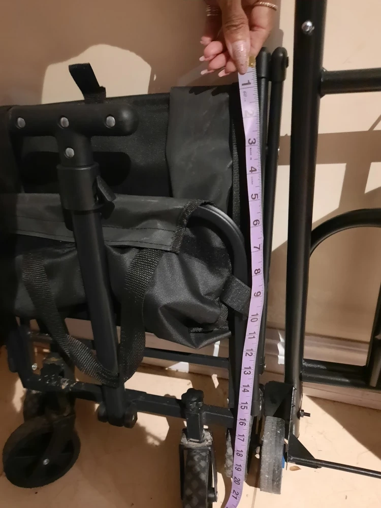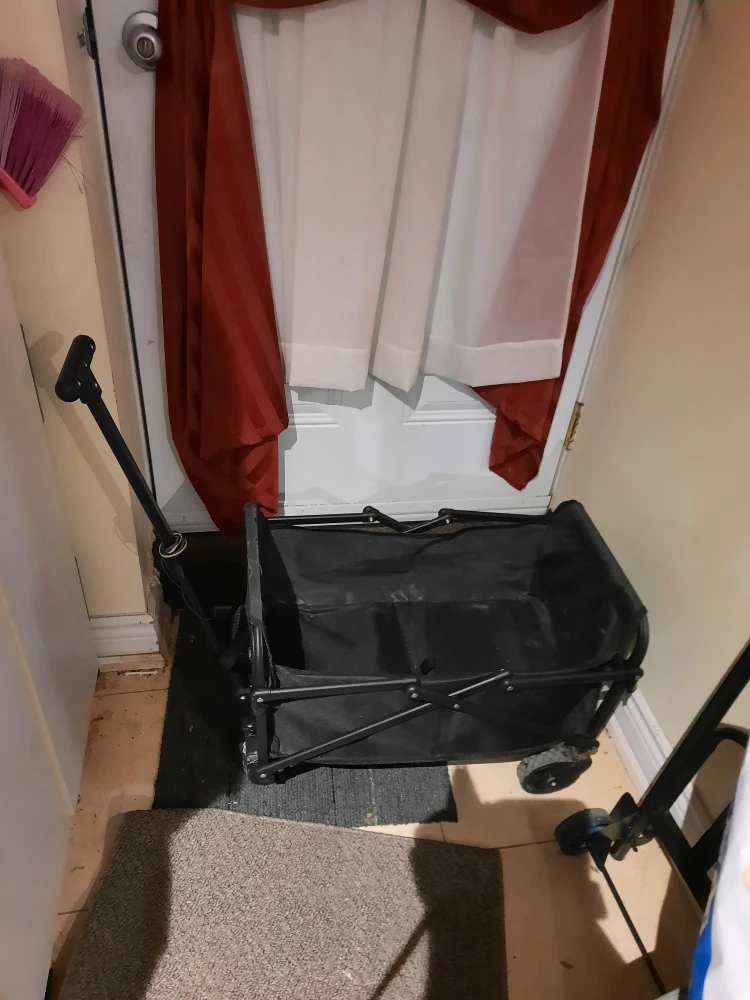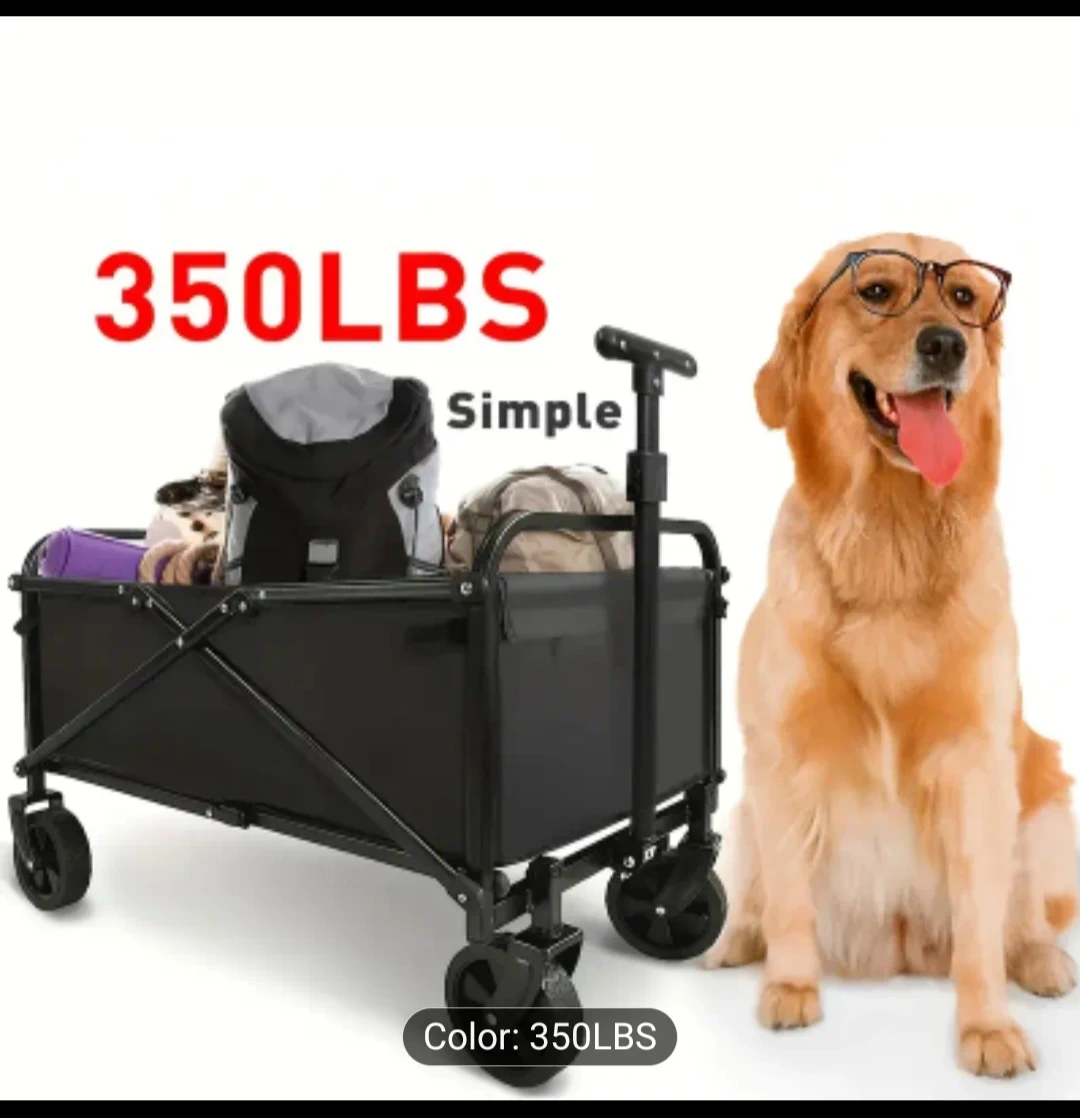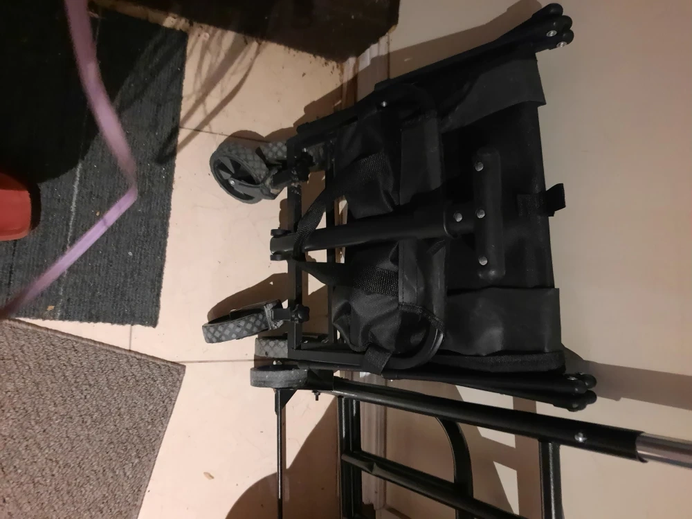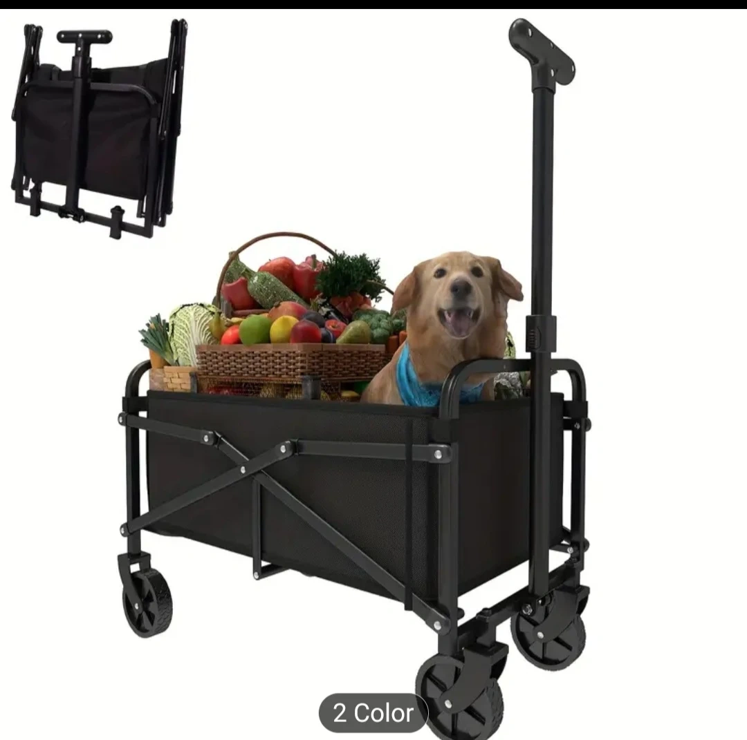 222This folding wagon cart is ready for your next adventure! It's black and looks to be in good condition. Can handle a load of up to 350lbs, perfect for carrying groceries, camping gear, or anything else you need to haul around. Gently used