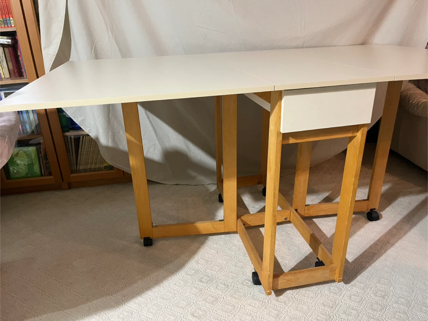 Selling a folding drop leaf table, perfect for small spaces! It has a handy drawer for storage and folds down easily when you need more room. Great for apartments or condos. Was originally a quilters table. In great condition! It’s super heavy. 40"x72"