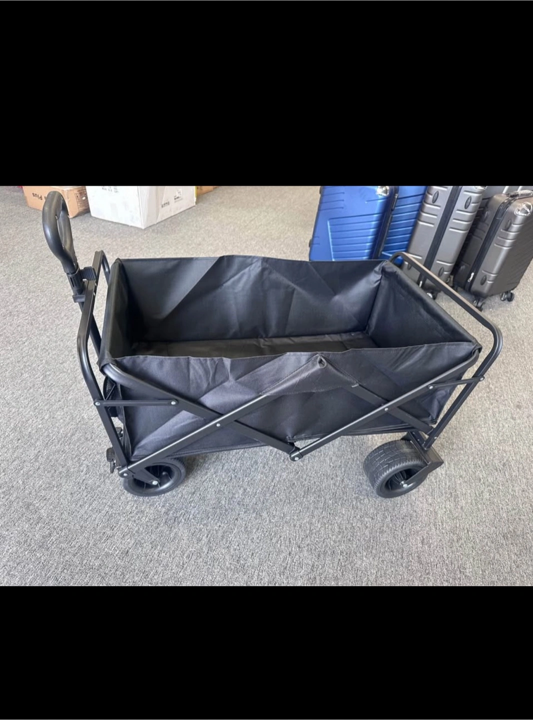 Selling a folding wagon cart in black! It's perfect for hauling groceries, camping gear, or anything else you need to move around easily. It's in great condition and folds up for easy storage. Comes with the box