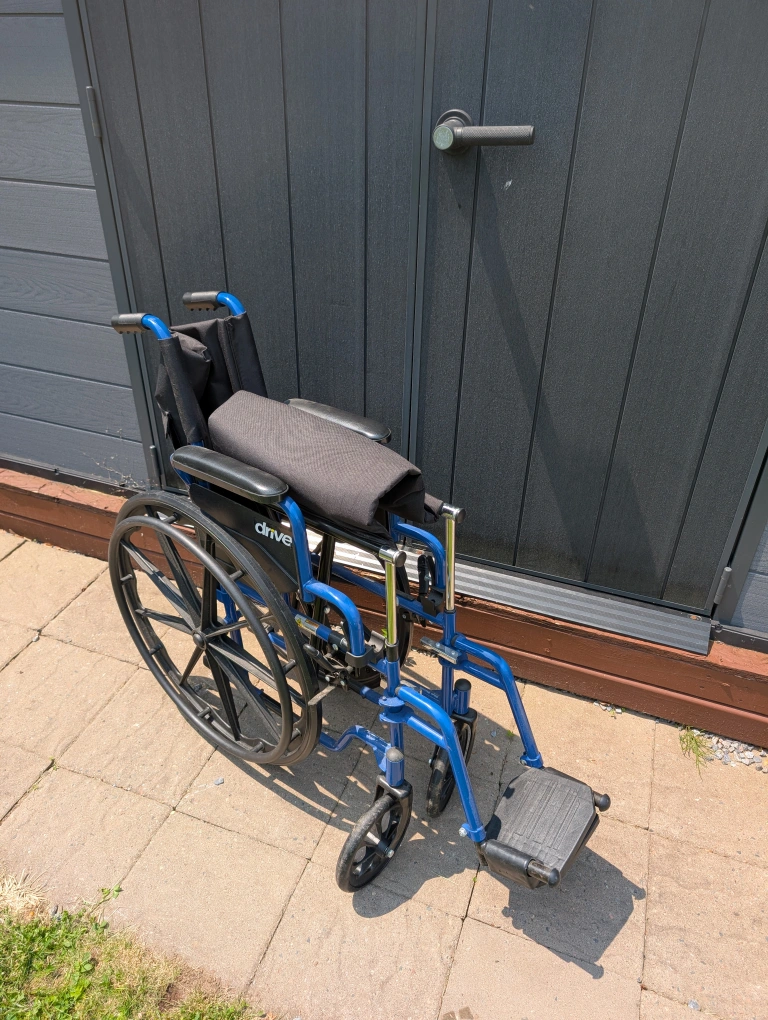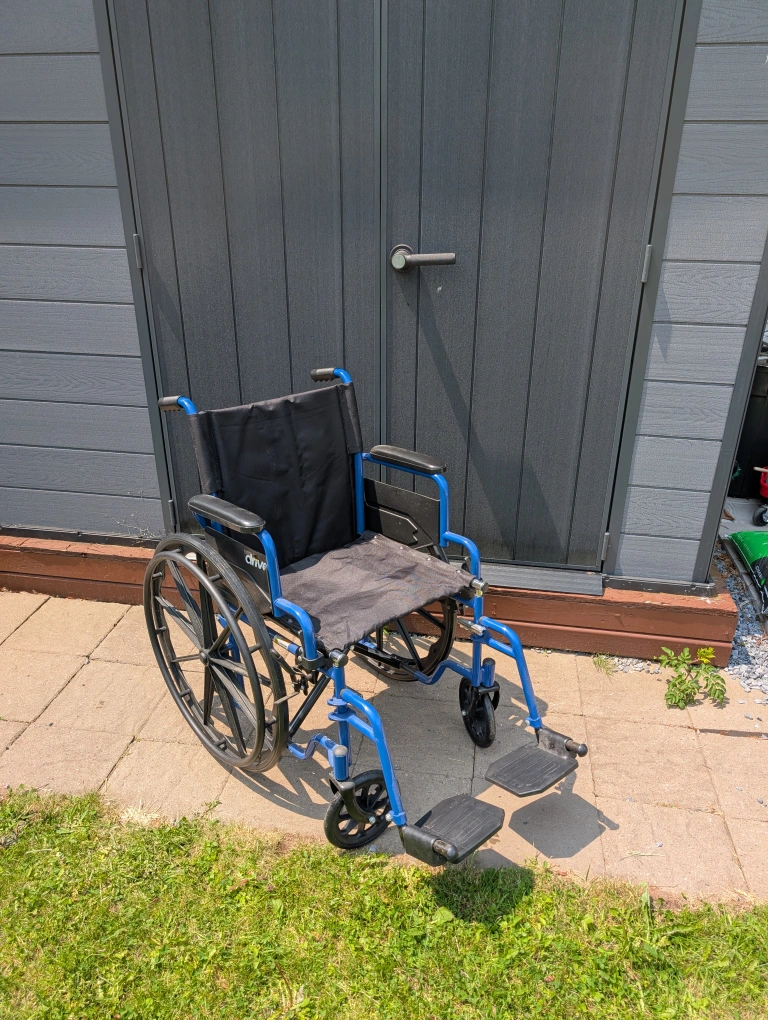 Wheelchair in great condition with a blue frame and black seat. Features footrests and armrests. Designed with large rear wheels. A great way to relax and get around.