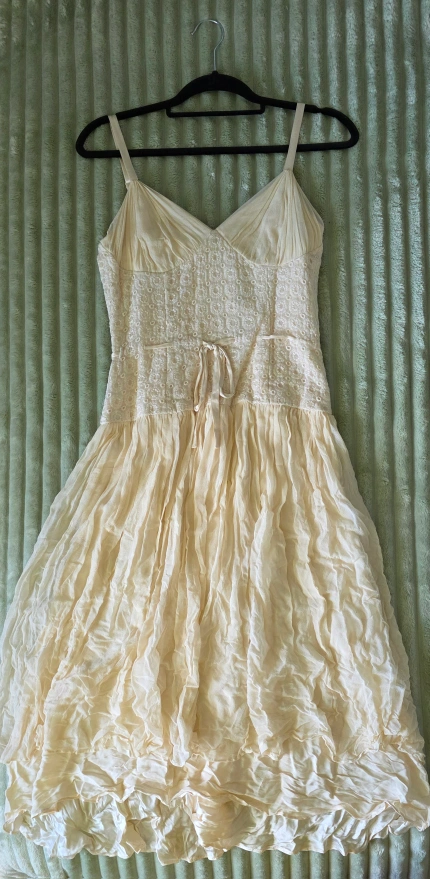 This GORGEOUS SILK DRESS is a lovely and demure CREAM / IVORY with EMBROIDERY - BUSTIER/FITTED BODICE STYLE, which is very flattering. NEW WITHOUT TAG. $375 RETAIL. DRESS is 100% SILK, with silk/spandex lining - which this lining feels AMAZING against your skin. SILK SASH/TIE can be tightened or loosened, and is at waistline. The dress has elongated waistline/drop waist to finish out the EMBROIDERED part, and the skirt flows beautifully past that, with it being a gorgeous silk chiffon. GODDESS VIBE. ETHEREAL. FAIRY. BALLERINA. DRESSY or BOHO CASUAL.