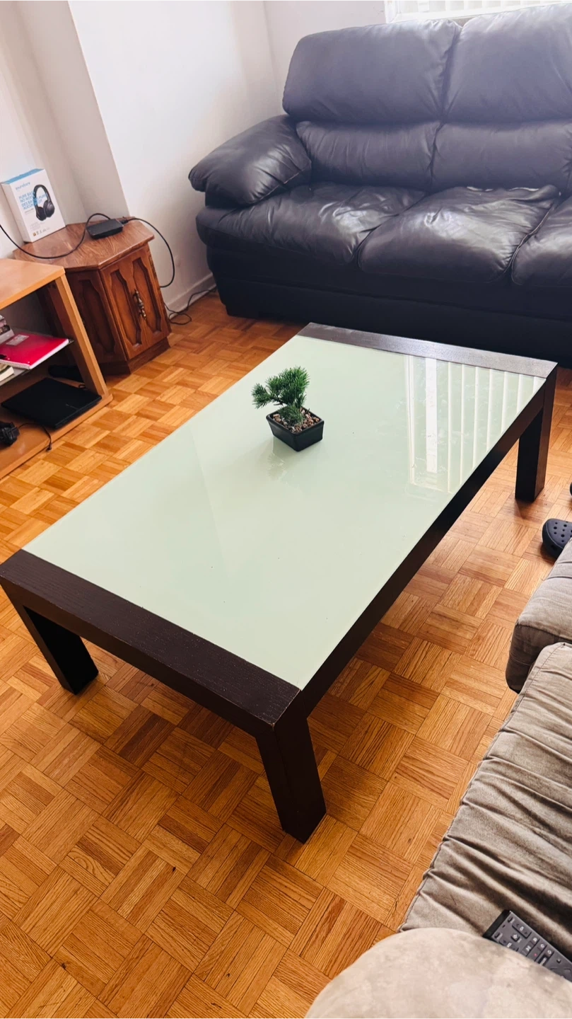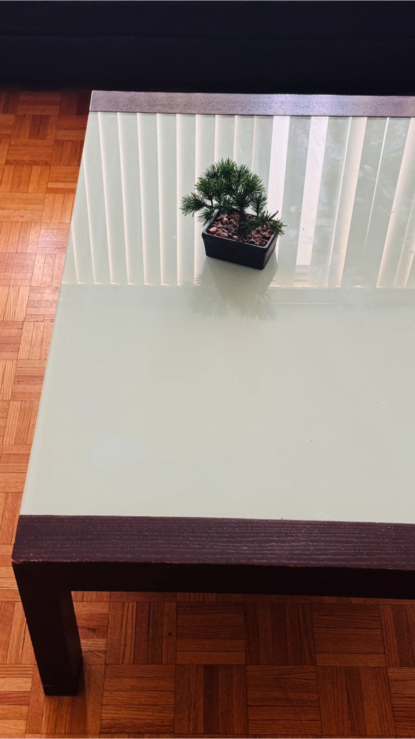 A modern coffee table featuring a frosted glass top and a dark wood frame. It's a rectangular shape, perfect for a living room setting. This table adds a clean and contemporary look to any space. Pickup at 1200 york mills rd. Available from May.