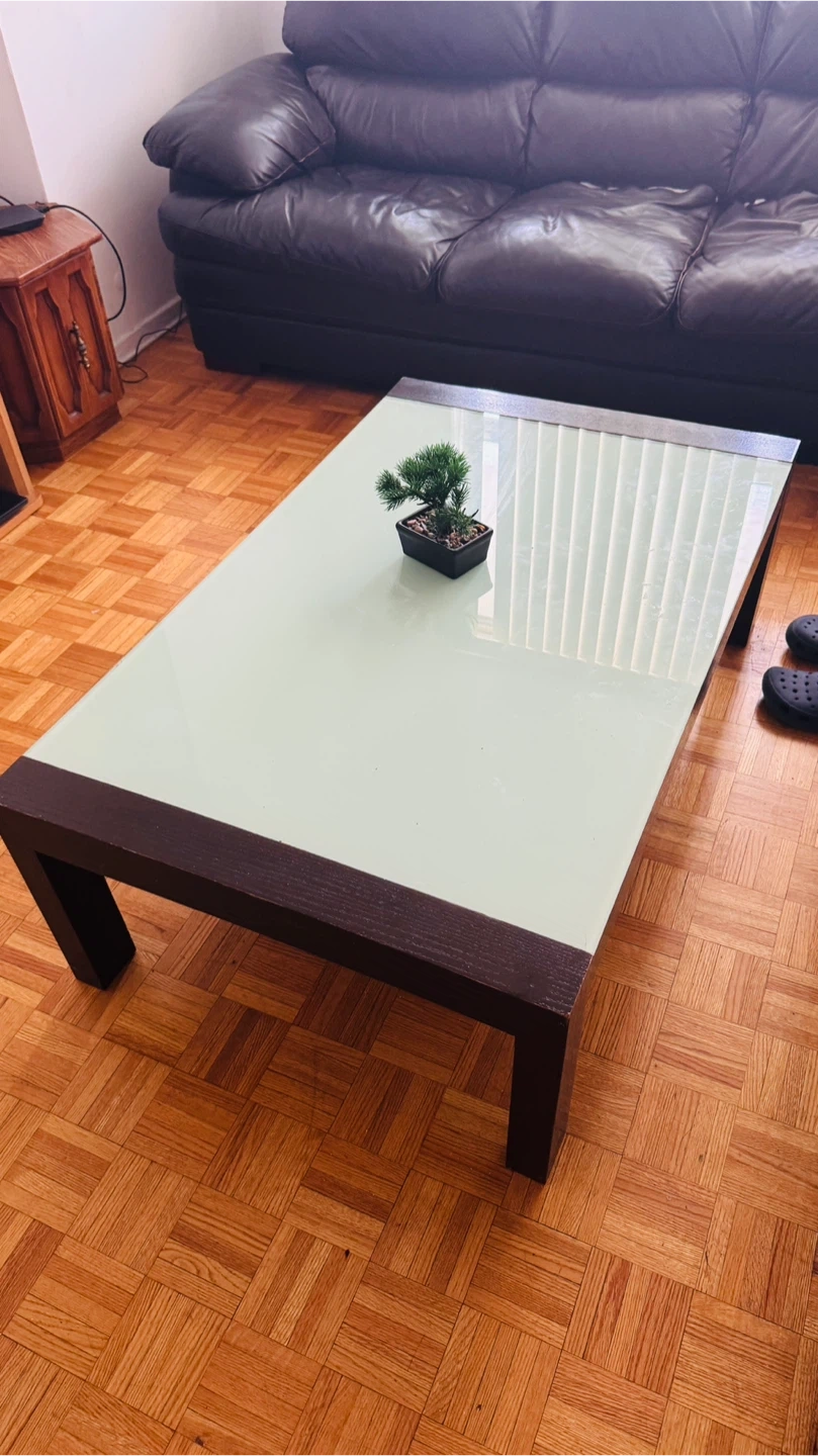 A modern coffee table featuring a frosted glass top and a dark wood frame. It's a rectangular shape, perfect for a living room setting. This table adds a clean and contemporary look to any space. Pickup at 1200 york mills rd. Available from May.