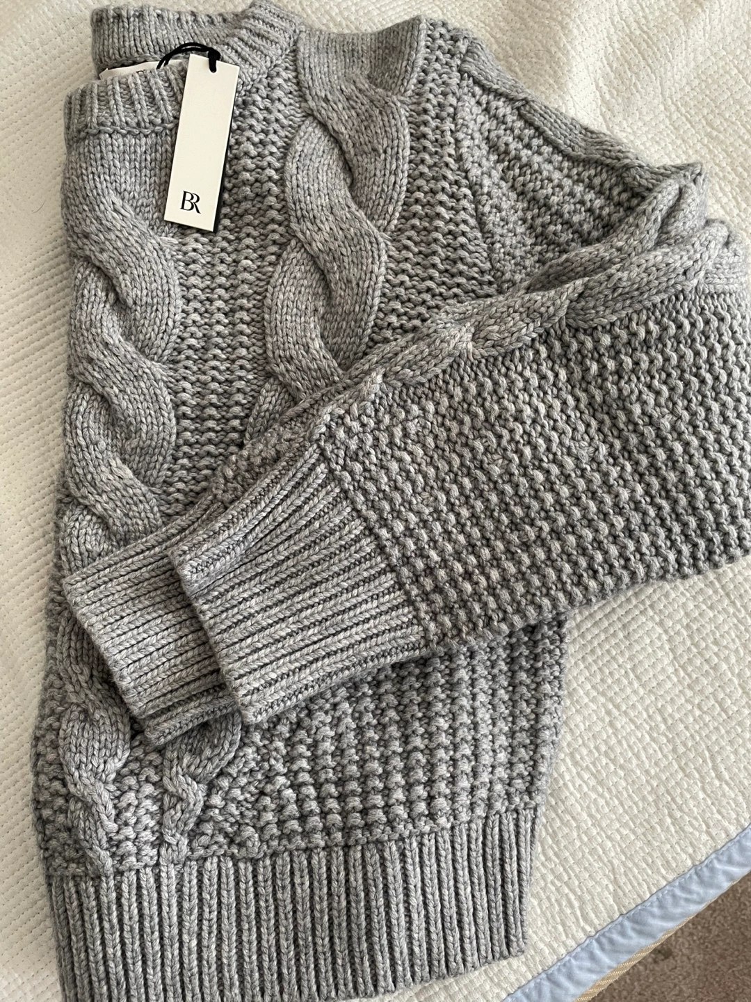 Cozy grey cable knit sweater. Features a relaxed fit and ribbed cuffs. Perfect for fall and winter.